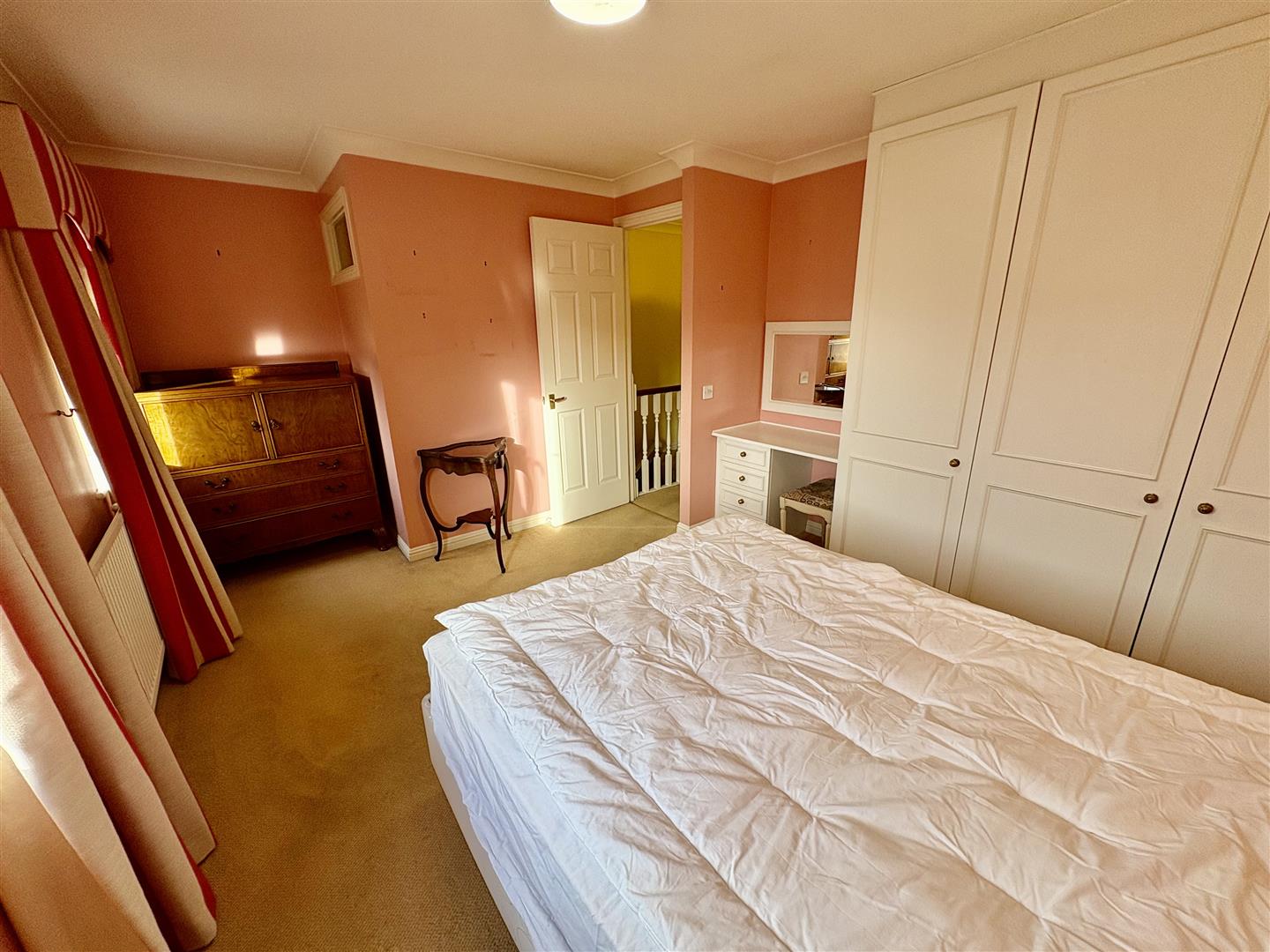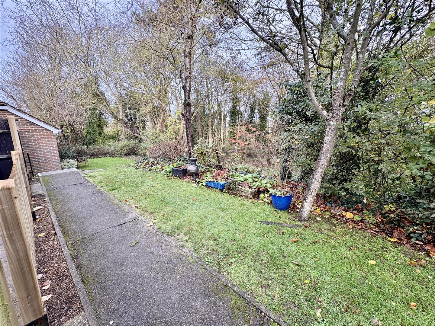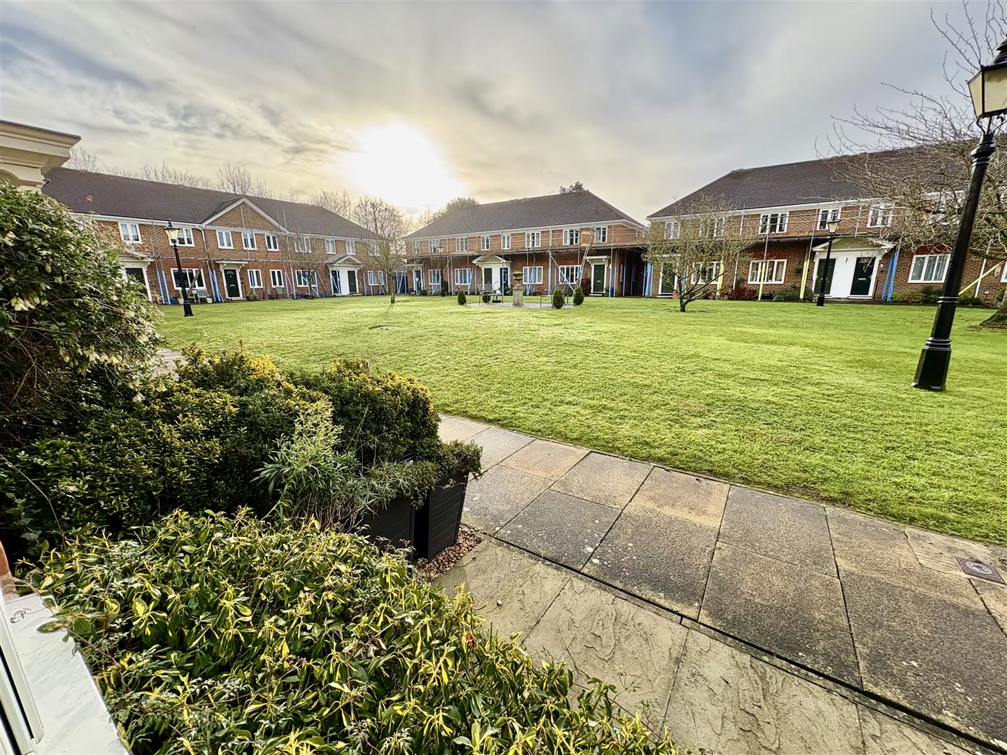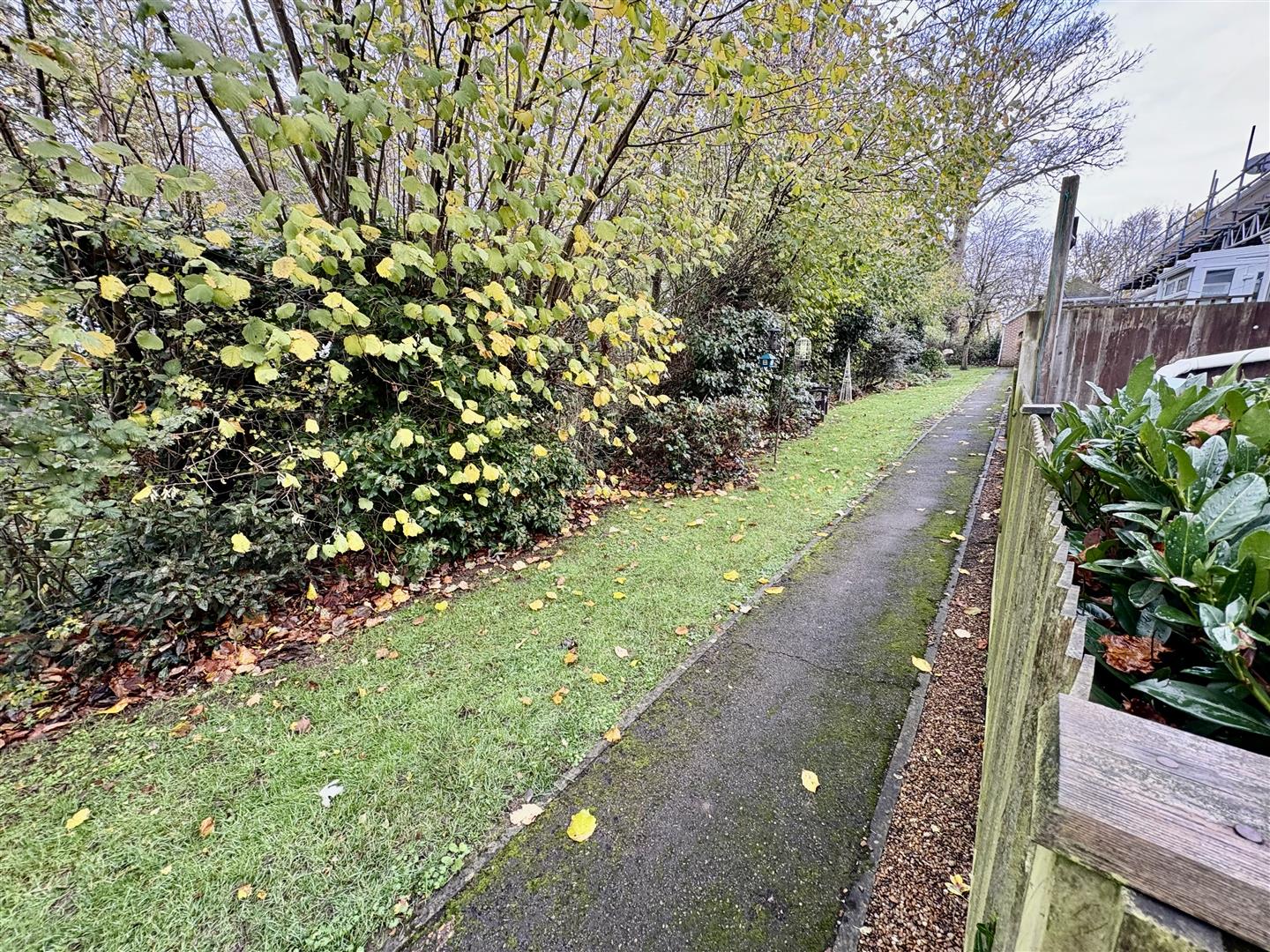 The rear garden is a manageable size with a paved patio area that leads out from the conservatory, bordered by mature shrubs and trees providing privacy. A peaceful communal green space is accessible nearby, perfect for quiet walks or relaxing outdoors.