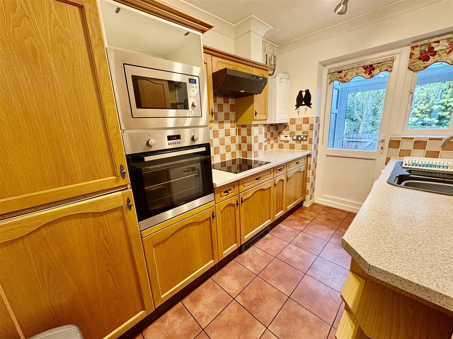 The kitchen is a galley style with ample storage in wooden cabinetry and contrasting tiled splashbacks. It features an integrated oven and microwave, an inset sink, and appliances including a washing machine and dishwasher. A door leads directly out to the conservatory and on to the garden.