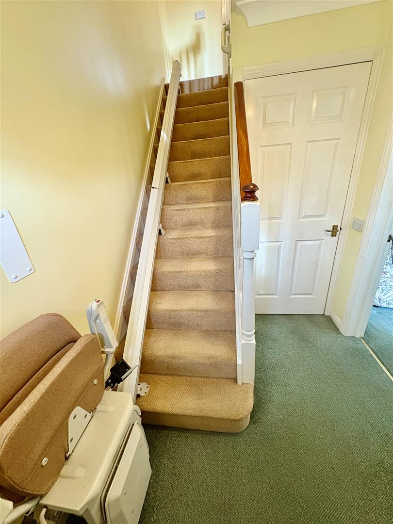 This welcoming entrance hall features neutral carpeting, a practical stairlift fitted to the stairs for ease of access, and a convenient cloakroom including storage cupboard. It connects smoothly to the lounge and provides access to the first floor.