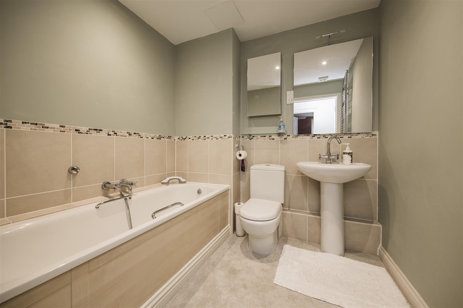 The main bathroom features a bath, toilet, and pedestal sink, with a tiled surround and flooring in neutral tones, creating a clean and fresh space for everyday use.