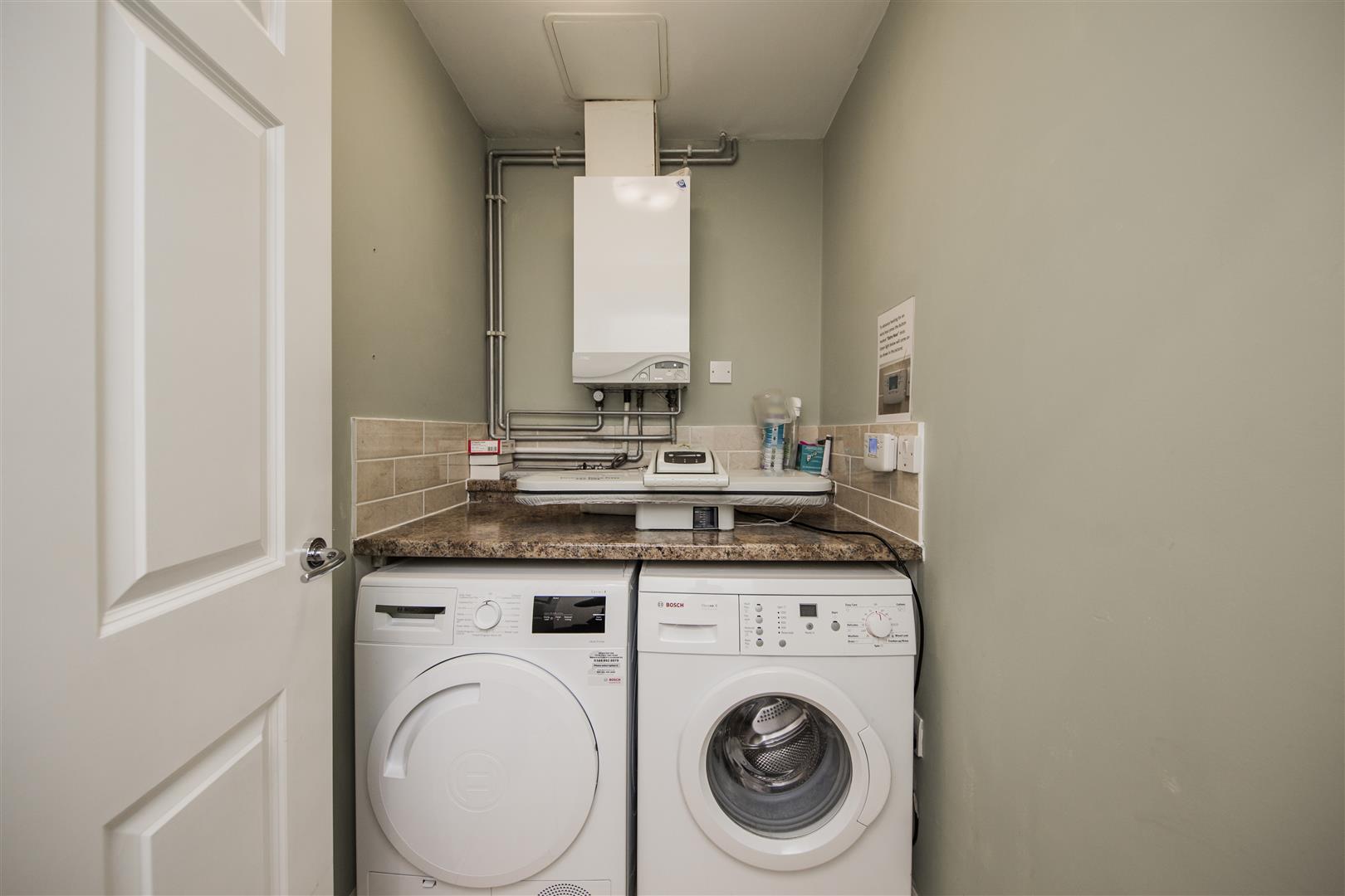 This utility room is fitted with a washing machine and a tumble dryer beneath a countertop, with ample space and plumbing for practical laundry needs. It also houses the boiler and has a neutral colour scheme for easy maintenance.
