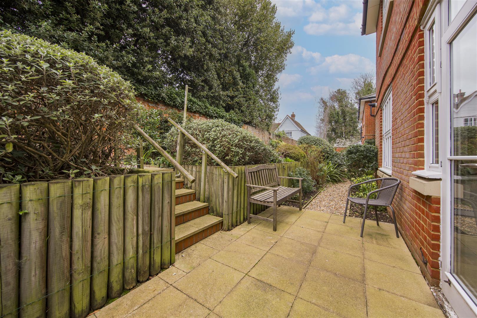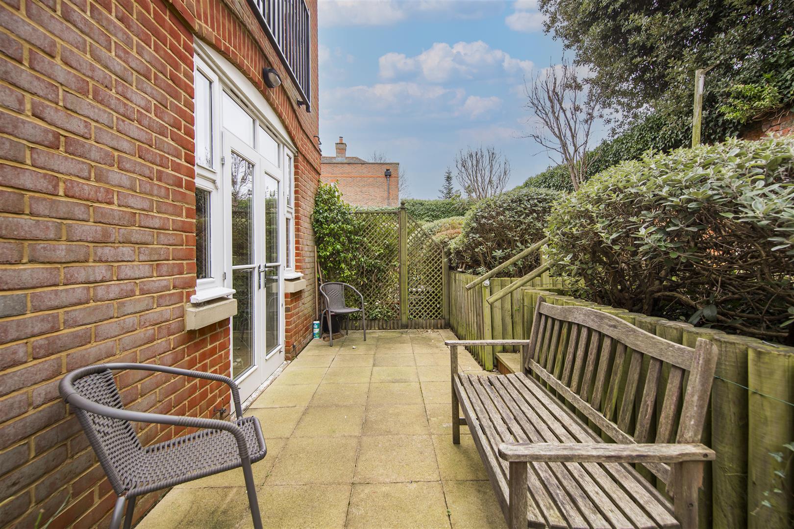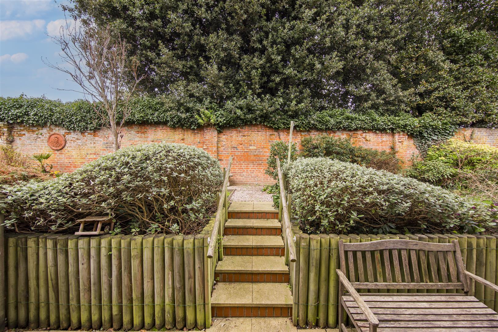 The rear garden is an attractive and well-maintained outdoor space offering a paved patio area ideal for seating and relaxing. Stone steps lead up to a raised communal section with mature planting. Beyond, a lawned garden area is bordered by mature hedges and a charming brick wall, framing the garden with traditional character and providing a peaceful setting.