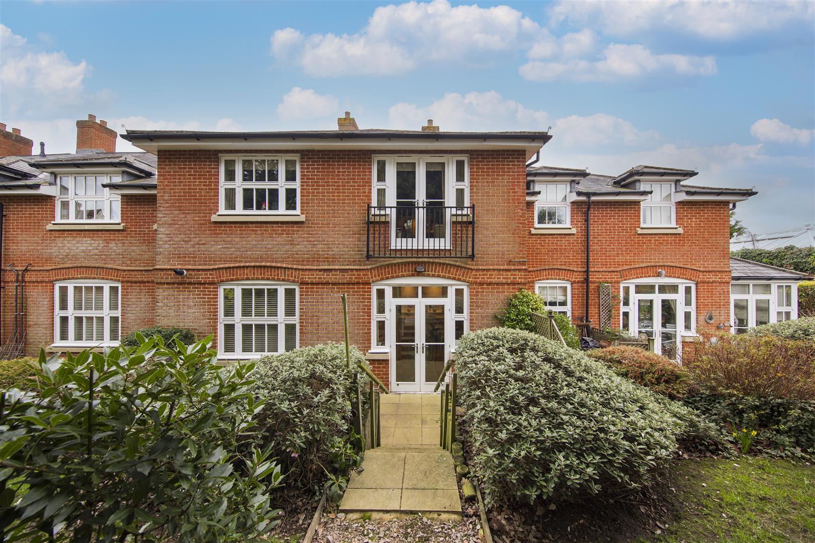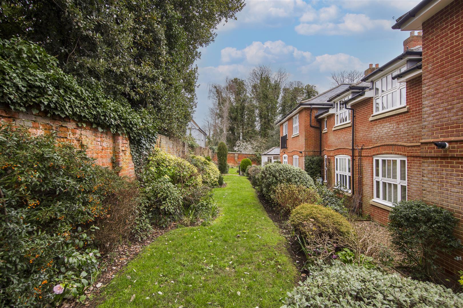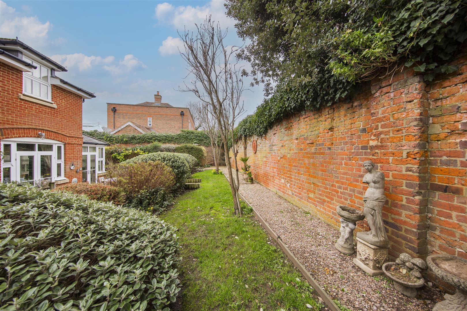 The rear garden is an attractive and well-maintained outdoor space offering a paved patio area ideal for seating and relaxing. Stone steps lead up to a raised communal section with mature planting. Beyond, a lawned garden area is bordered by mature hedges and a charming brick wall, framing the garden with traditional character and providing a peaceful setting.