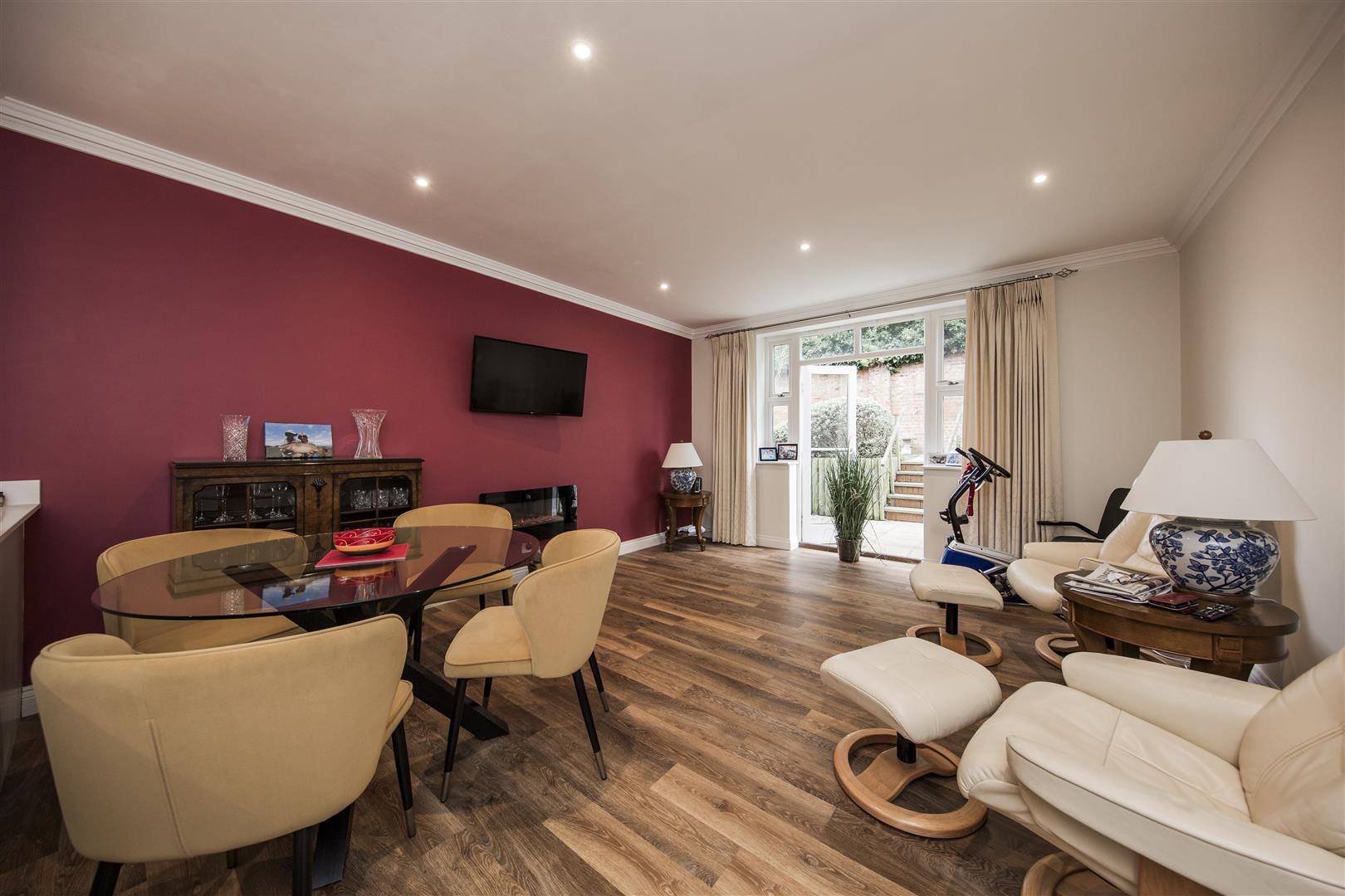 This bright and spacious open-plan kitchen, diner, and sitting room forms the heart of the home, measuring 7.07 by 4.22 metres (23'2" by 13'10"). It features a modern fitted kitchen with sleek cabinetry and integrated appliances, complemented by a wrap around breakfast bar with a sink. The dining area comfortably accommodates a table and chairs, while the sitting space includes comfortable seating and a contemporary electric fireplace. French doors lead out to the garden, allowing plenty of natural light to fill the room and providing seamless indoor-outdoor living opportunities. The warm wooden effect flooring and recessed ceiling lights add to the inviting atmosphere.