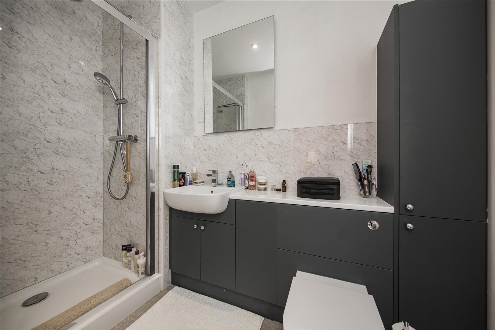 The master bedroom offers a calm retreat with soft carpeting and a neutral, warm palette. It measures 4.17 by 2.97 metres (13'8" by 9'9") and benefits from built-in wardrobes providing ample storage. The room is well-lit by a window and features a door leading to a stylish en suite shower room with contemporary fittings and grey cabinetry.