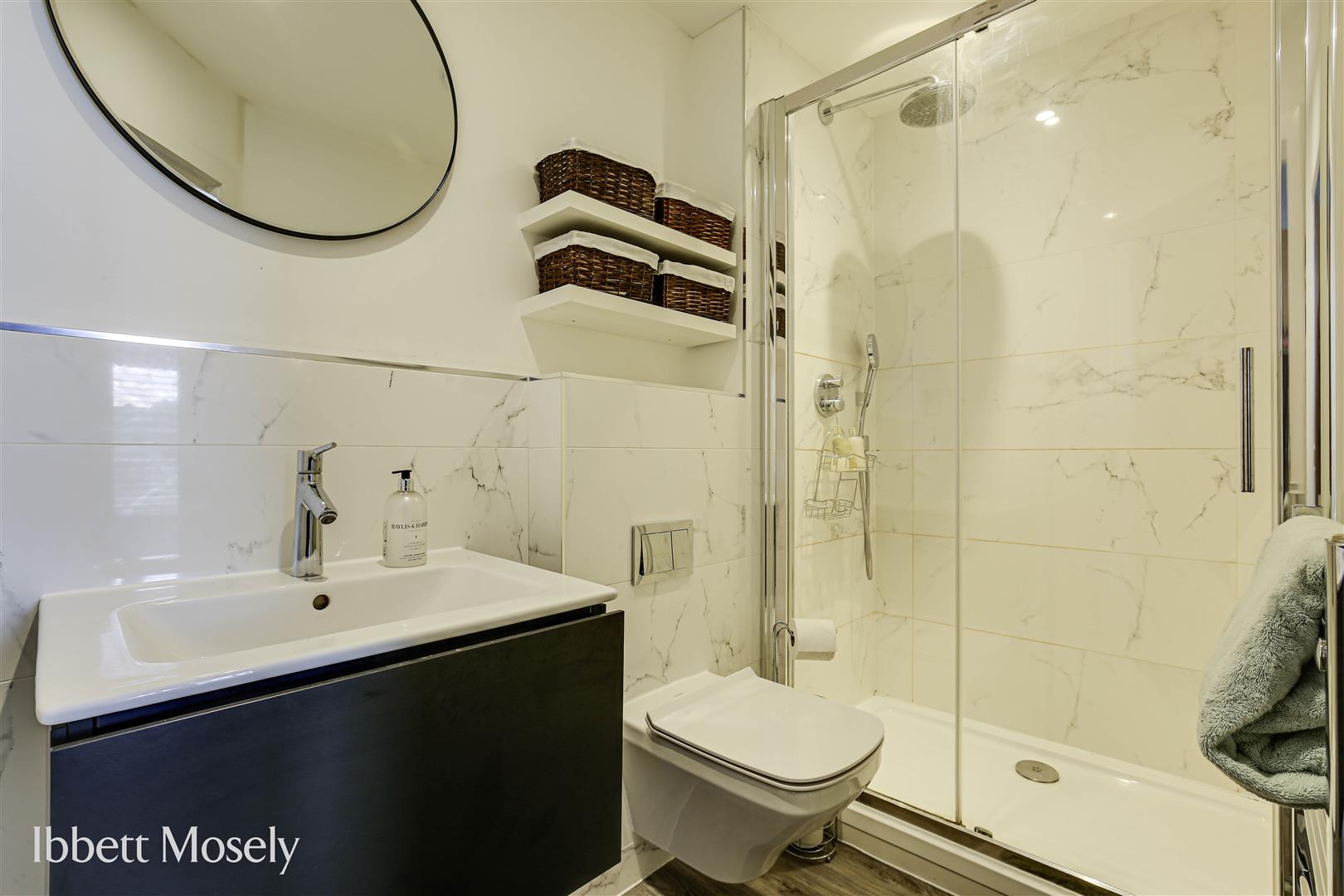 With shower cubicle, w.c., and hand basin with cupboard under. Chrome ladder style towel rail, wood flooring, extractor fan and shaver socket.