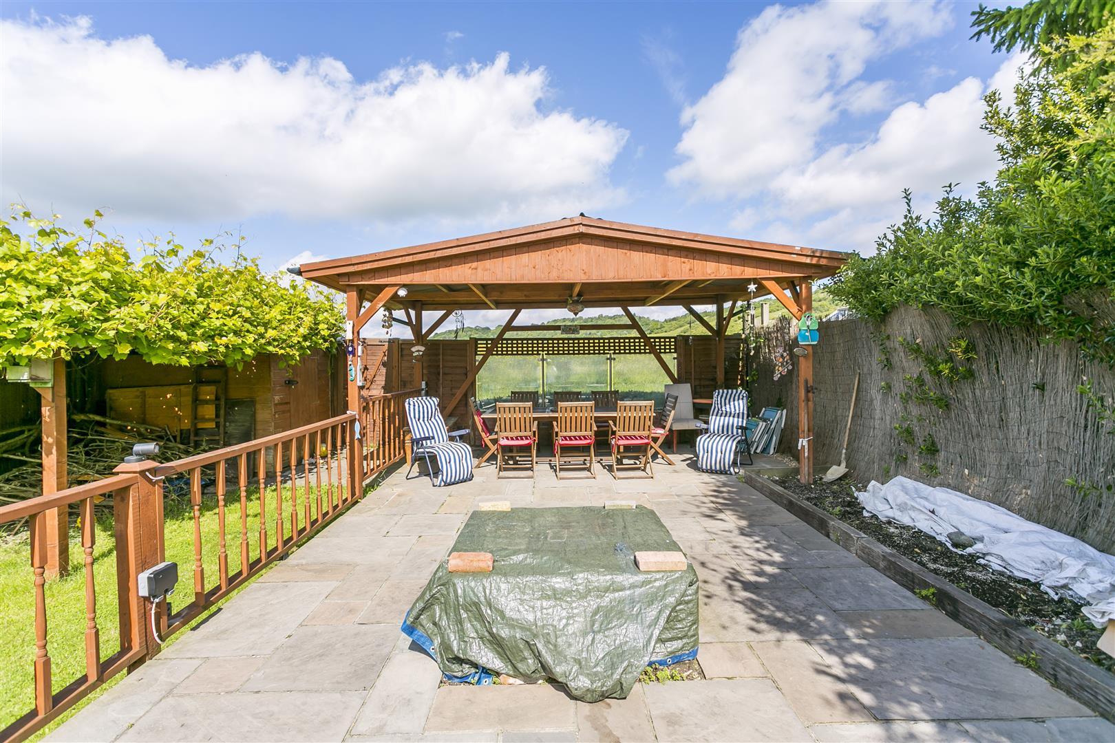 - Large decked patio area with covered seating are and fire pit