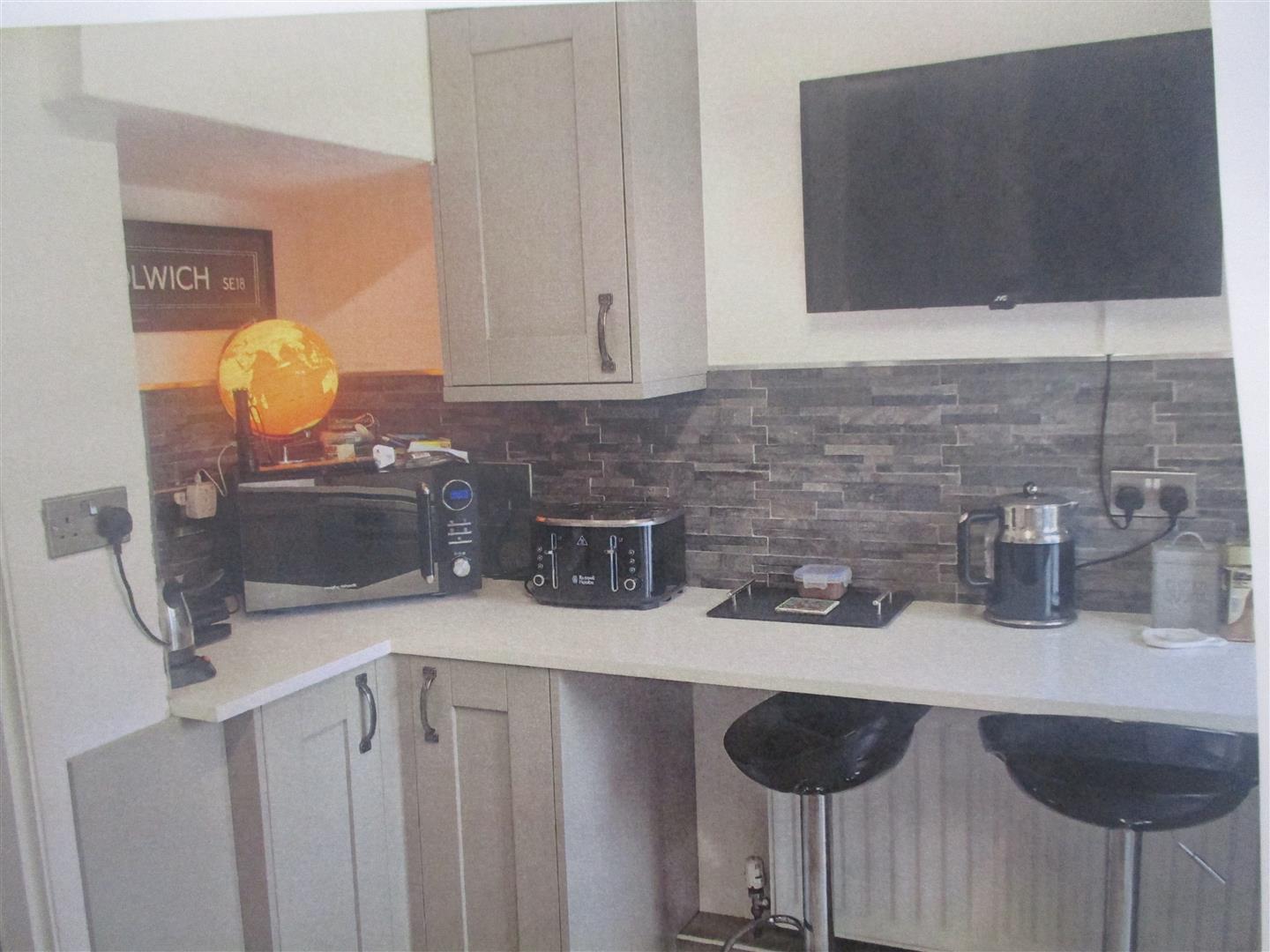 Two double glazed windows overlooking rear garden. Double glazed door to rear. Comprehensive range of shaker style wall and base units with work surfaces over. Breakfast bar. Built in double oven with 4 ring gas hob set into work top. Space and plumbing for washing machine, tumble dryer and dish washer. Wall mounted boiler for central heating and hot water system. Double glazed door to side.