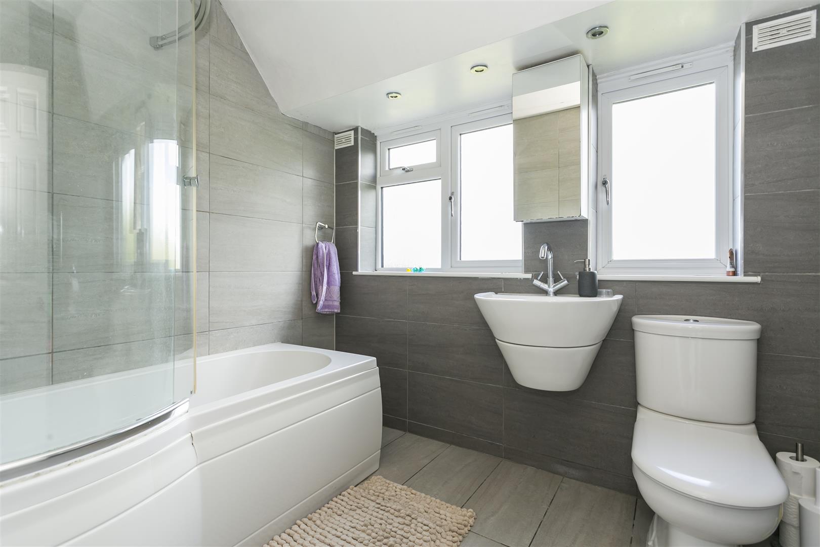 Two double glazed windows to rear. Suite comprising: shower bath and screen, wash hand basin, wc. Italian tiled surround. Tiled floor. Chrome heated towel rail. Down lighting.