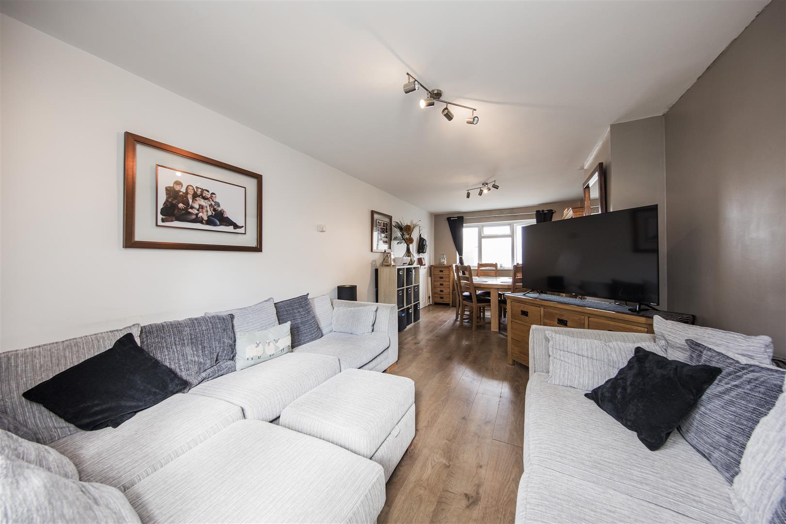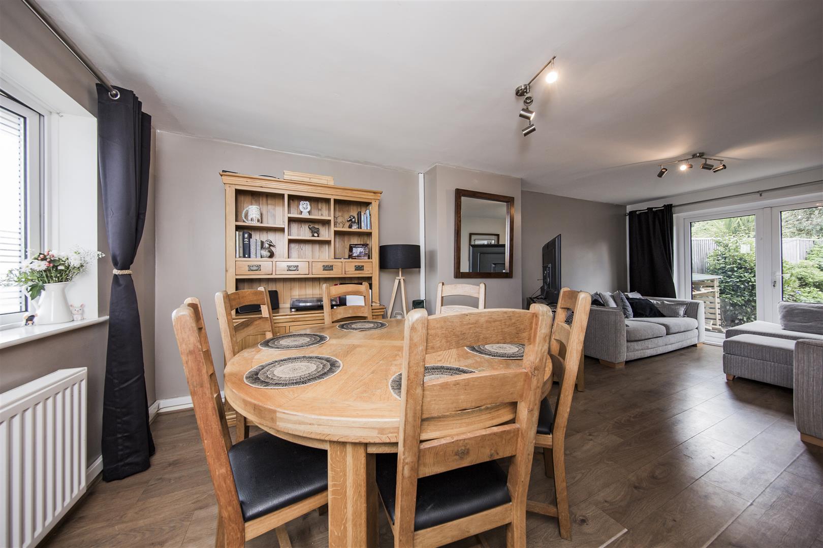 This inviting sitting and dining room stretches front to rear of the property, offering ample space for both relaxing and entertaining. Large windows and a set of French doors flood the room with natural light, creating a bright and airy atmosphere. The room is finished with wood-effect flooring and neutrally painted walls, providing a warm and welcoming space to unwind or enjoy meals with family and friends.