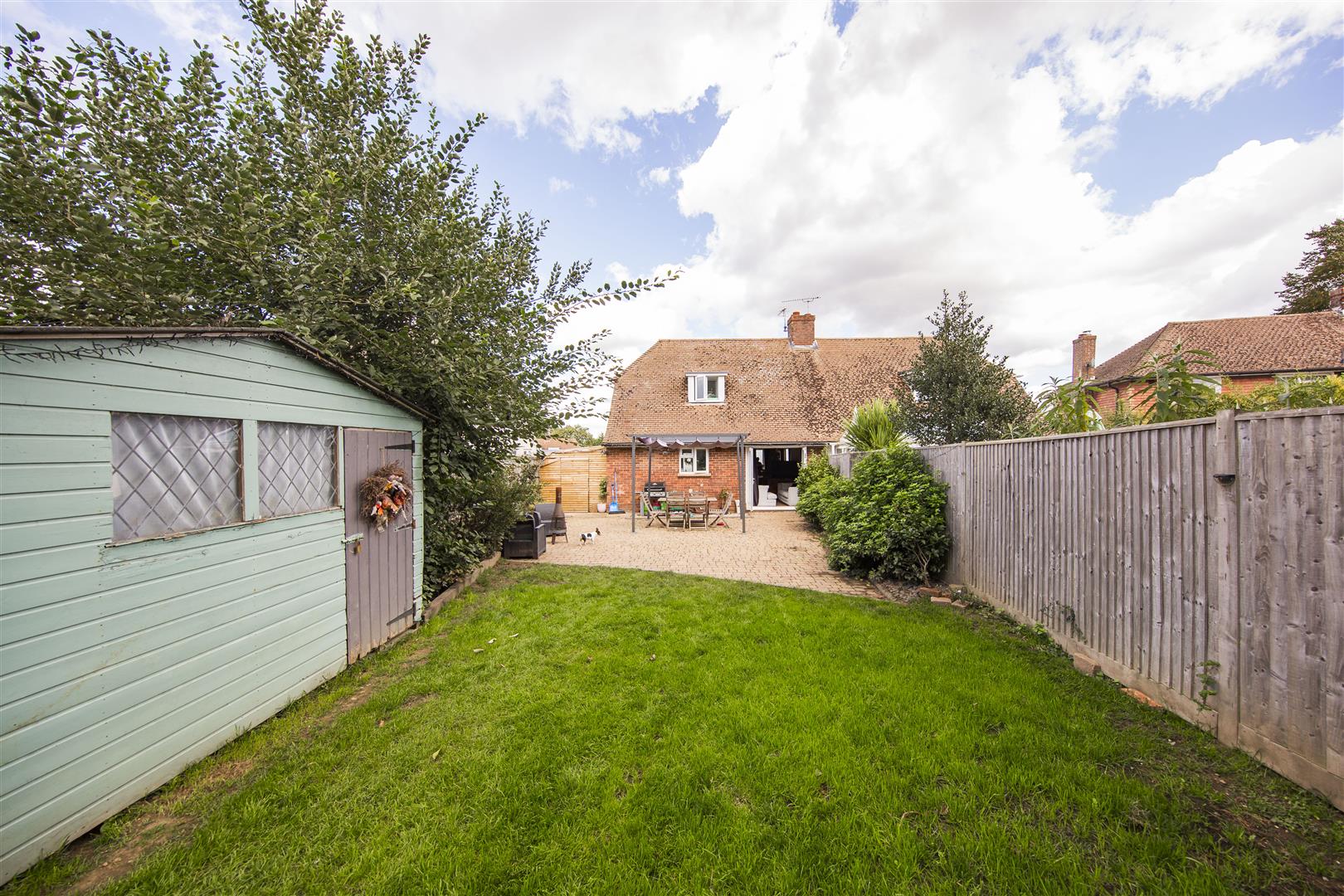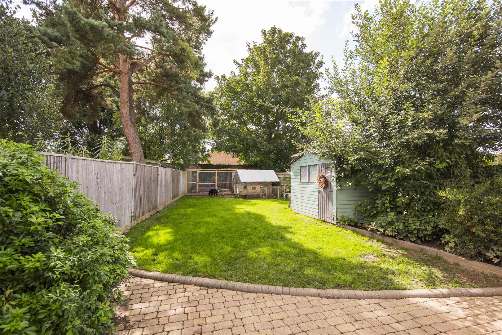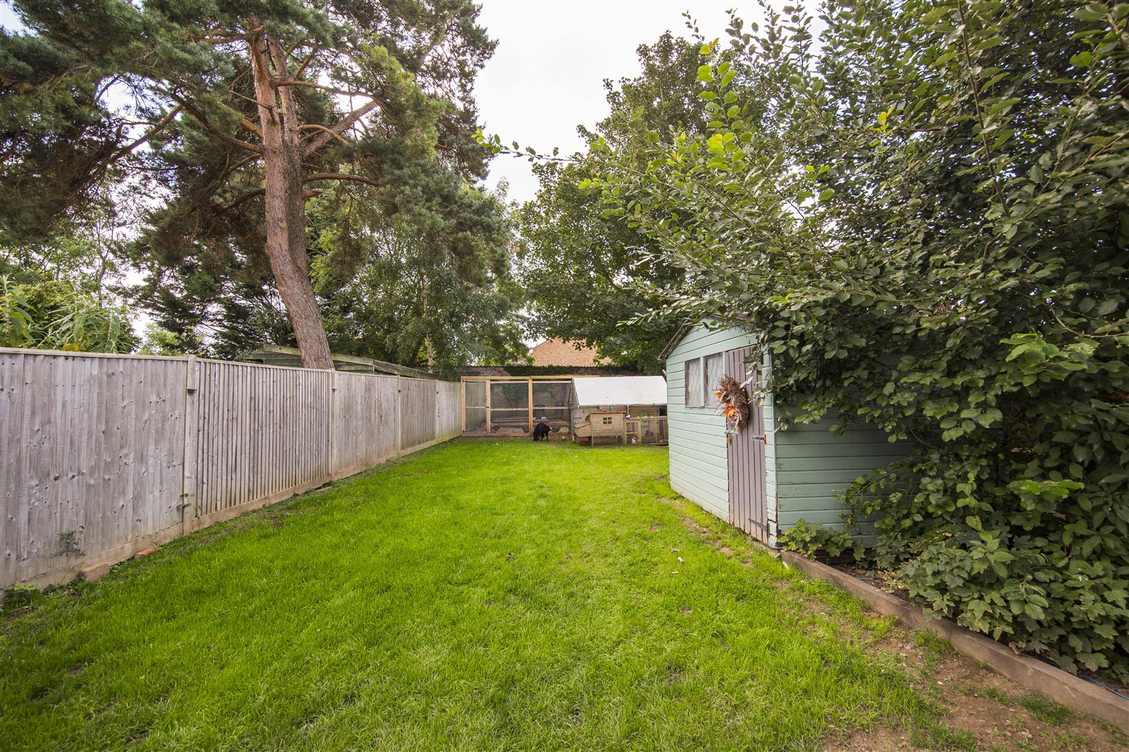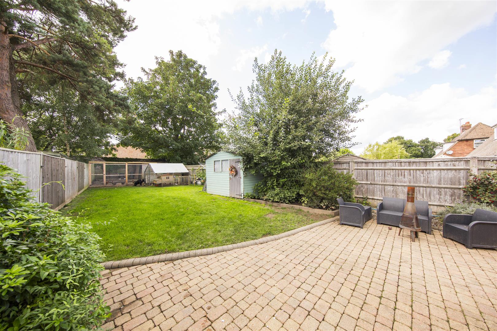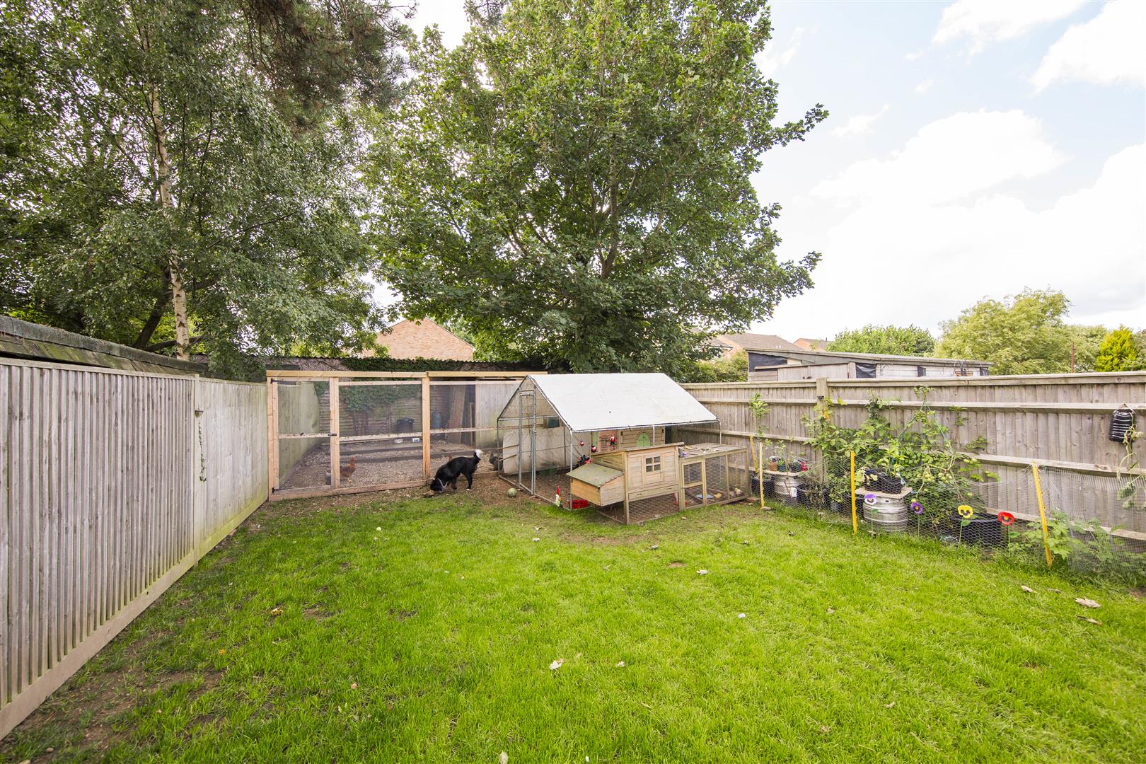 The rear garden is an inviting outdoor space combining a paved patio area and a well-maintained lawn. The patio features a pergola providing partial shade and multiple seating areas, ideal for alfresco dining or relaxing in the fresh air. The lawn is bordered by mature trees, bushes, and a large shed, while a chicken coop adds character and practicality for those with an interest in keeping hens. Wooden fencing encloses the garden, offering privacy and security.