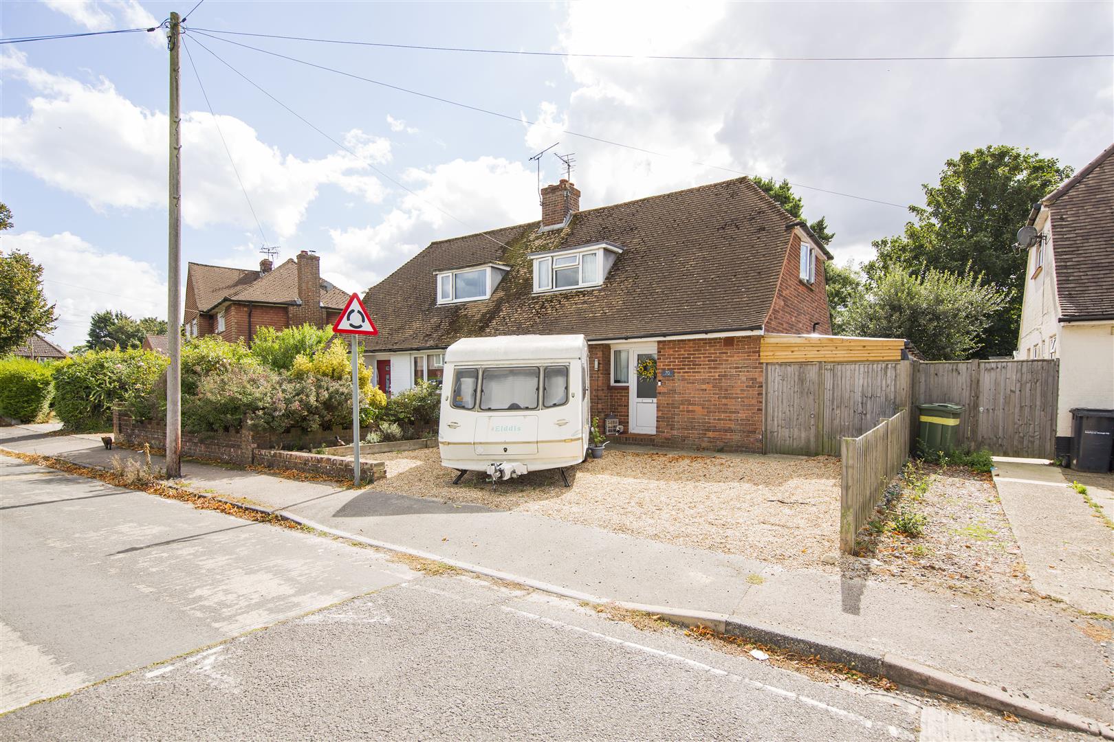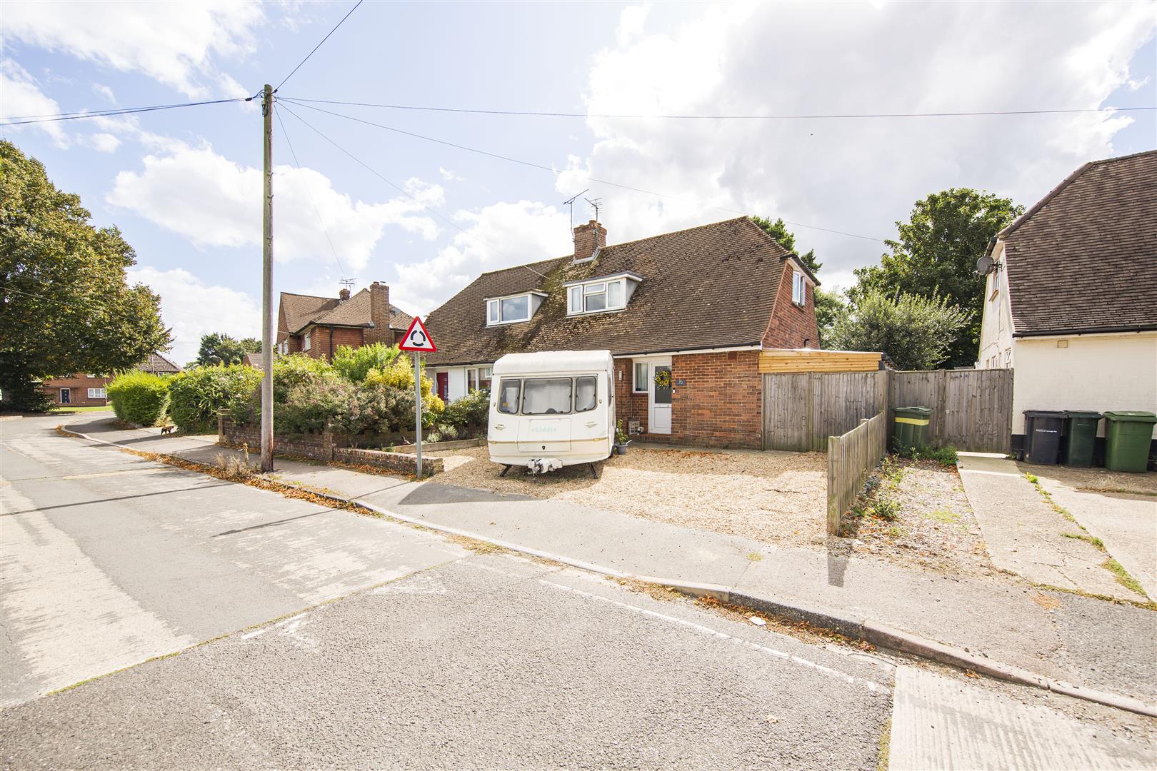 The front exterior presents a semi-detached home with a pitched roof and brickwork construction. The driveway provides off-road parking for multiple vehicles and is bordered by low fencing and mature shrubs, enhancing the home's kerb appeal within a quiet residential street setting.