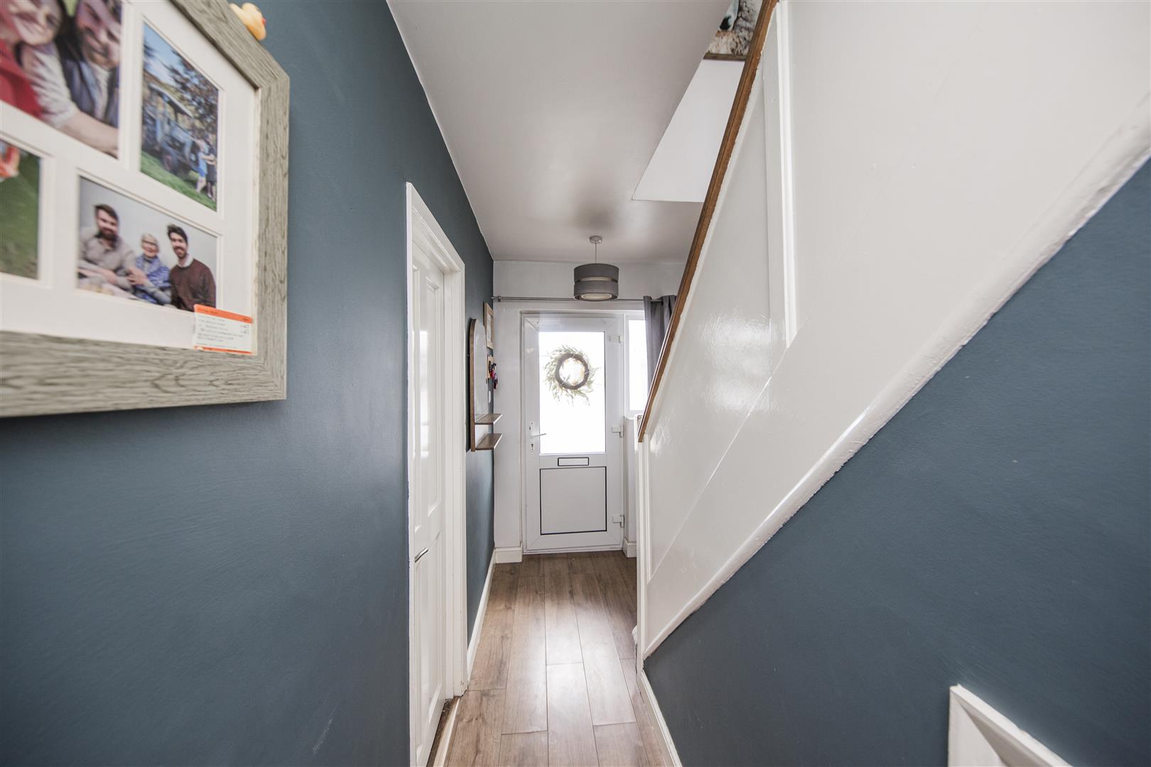 The entrance hall is welcoming, with a practical layout that leads directly to the sitting/dining room, kitchen, and stairs to the first floor. It features wood-effect flooring and walls painted in a muted blue tone, adding a subtle splash of colour. A stair gate is fitted for safety, making it ideal for families with young children.