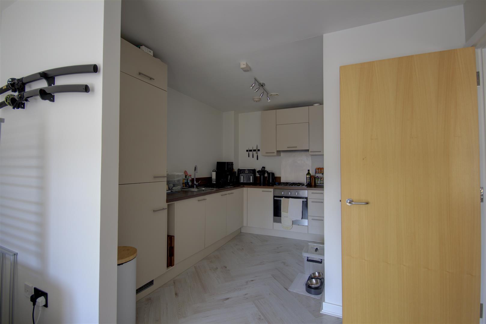 Kitchen - 3.62 x 2.18 (11'10" x 7'1") - Open plan kitchen with built in appliances inclusive of oven, gas hob, washing machine and fridge/freezer. Complimented by laminate wooden flooring.
