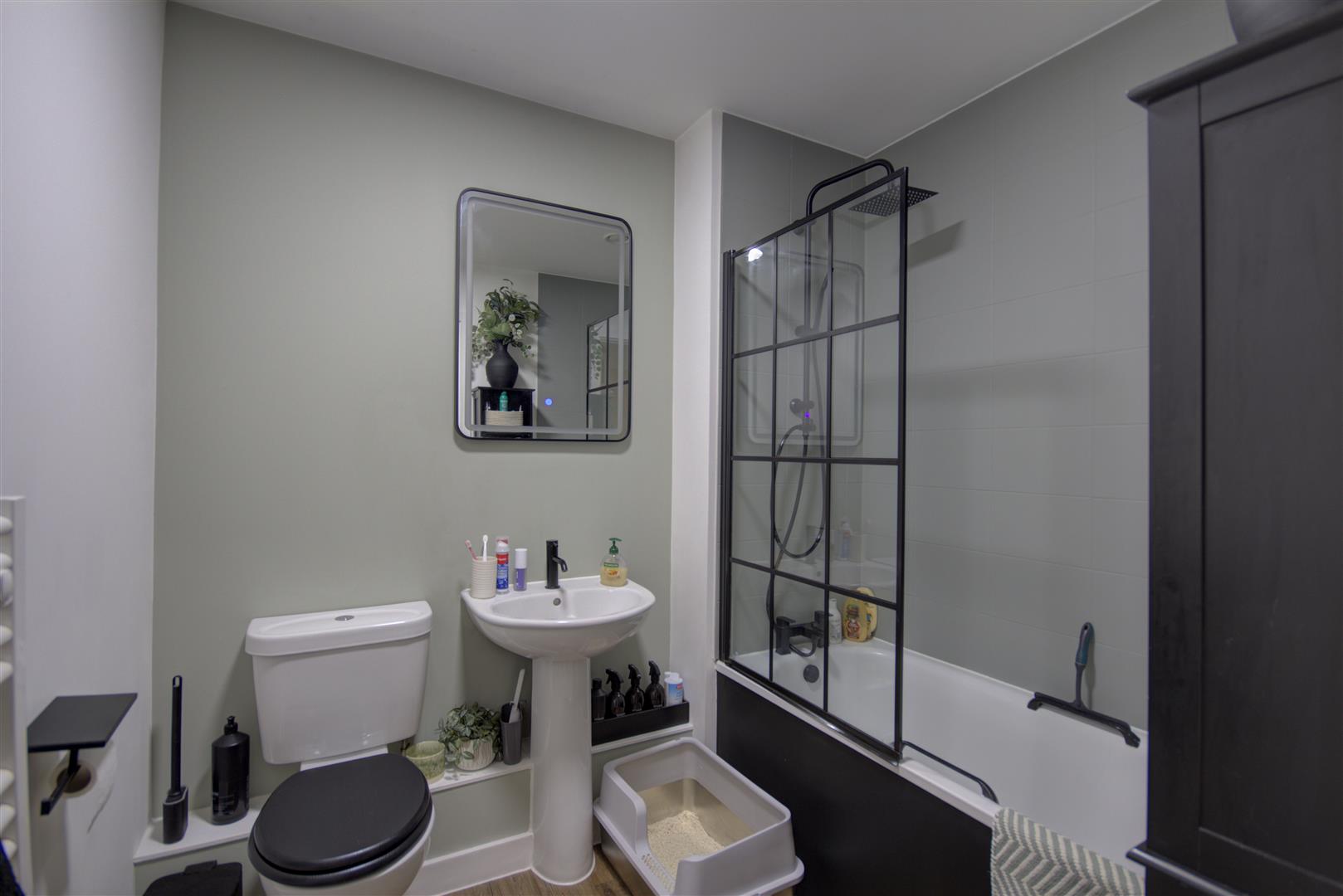 Bathroom - 1.96 x 2.25 (6'5" x 7'4") - Complete bathroom inclusive of bath with over shower, WC and wash basin.