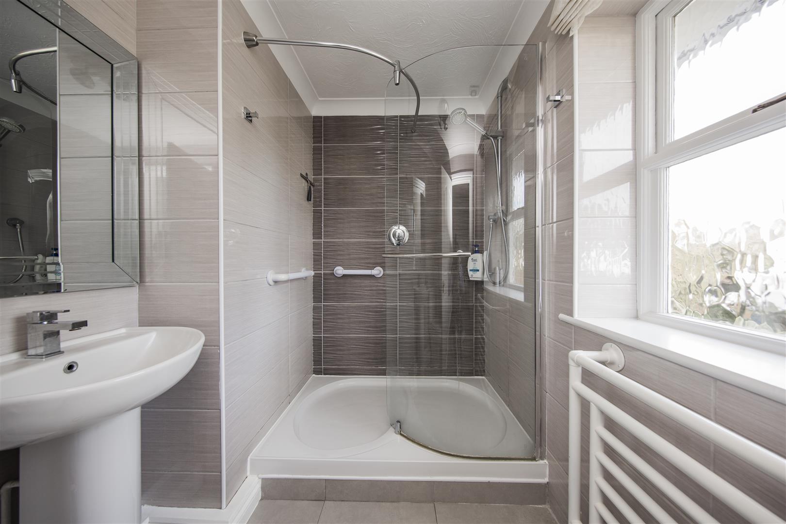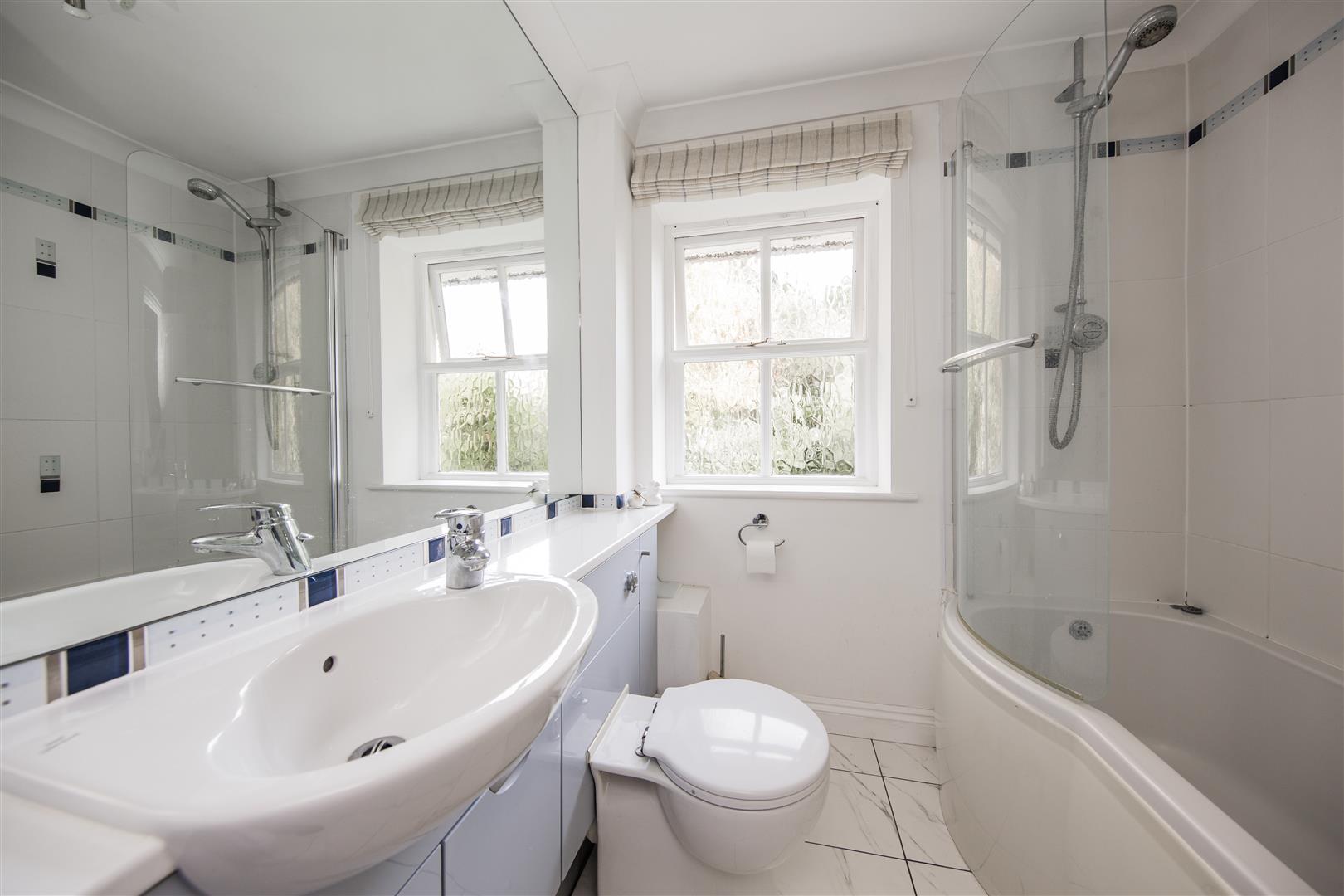 The ensuite is tastefully finished with a combination of light and darker tiles, featuring a walk-in shower area with a curved glass screen. A pedestal basin and a heated towel rail complete this practical and contemporary space. It also benefits from underfloor heating.