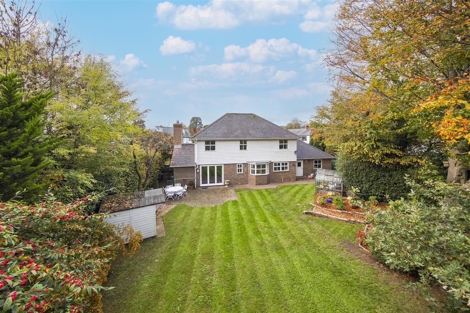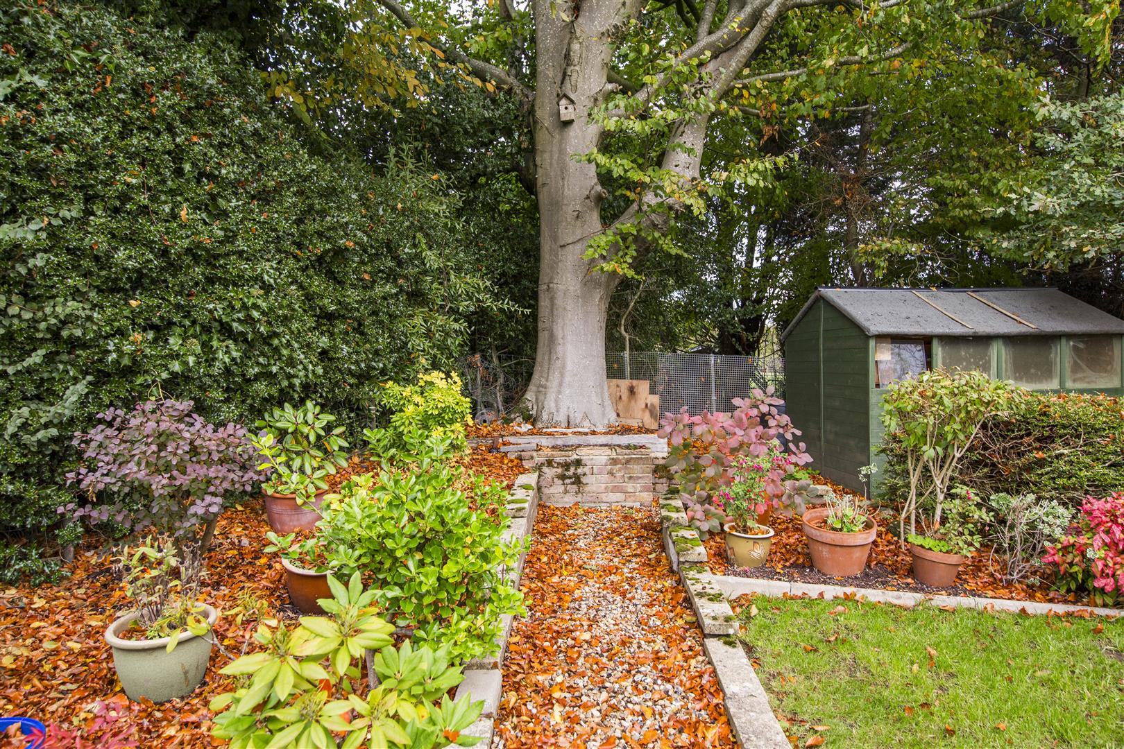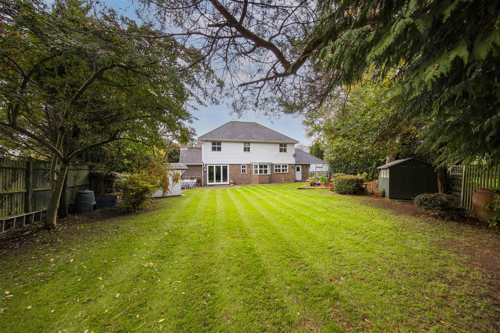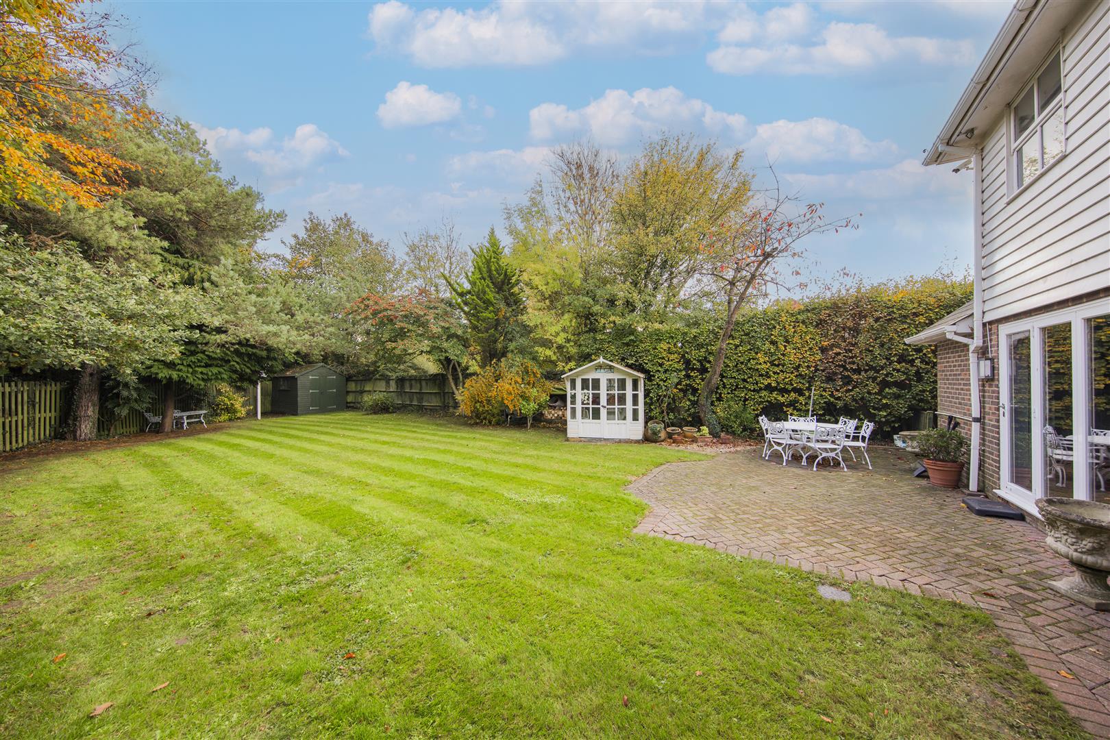 The Rear Garden is a generous and well-maintained outdoor space featuring a large lawn bordered by mature trees and shrubs, creating a private and peaceful setting. There is a paved patio area with garden furniture, ideal for outdoor dining or relaxing, as well as a charming summer house nestled at the far end of the garden.