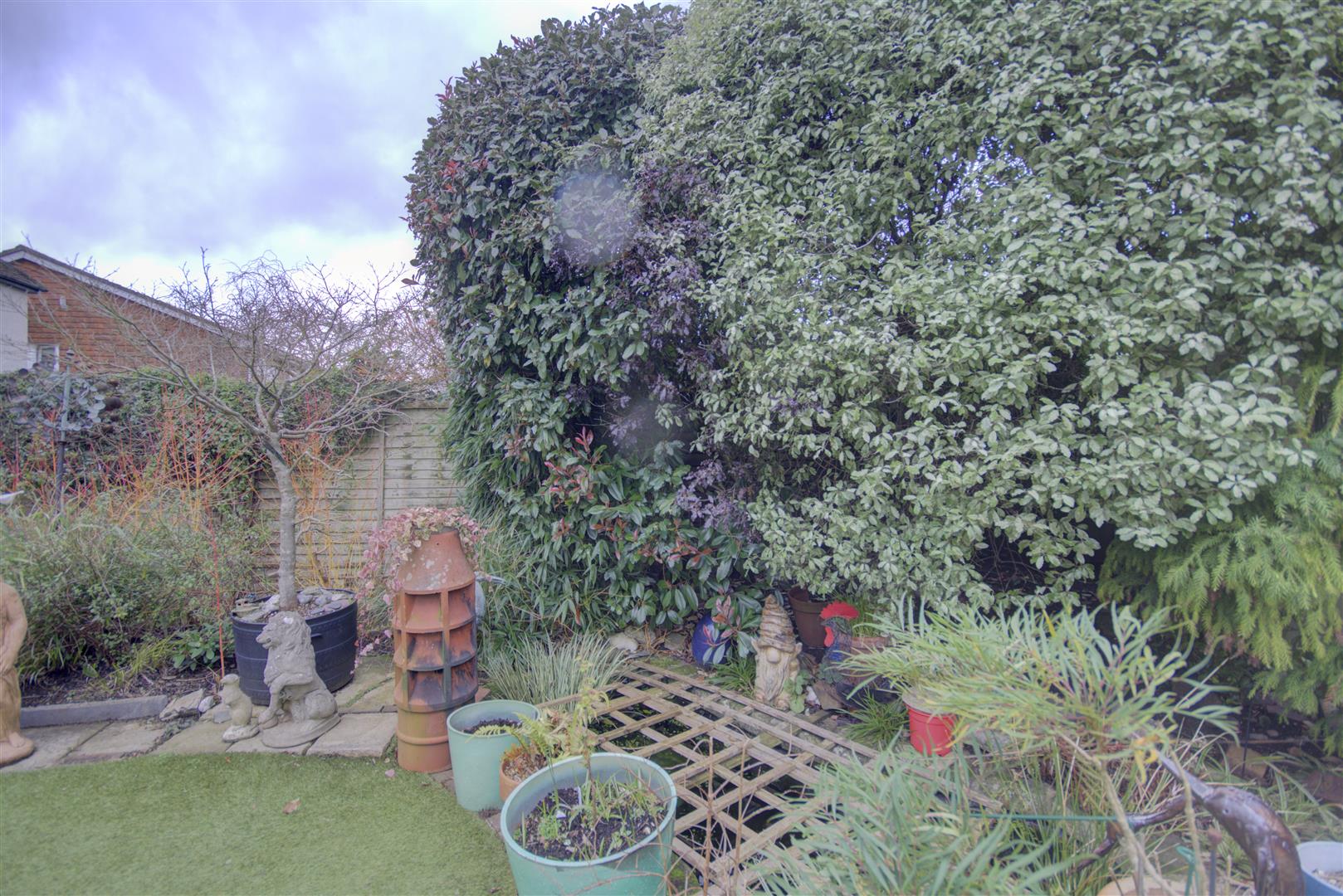 Outside, the property enjoys a driveway providing parking for several cars, bordered by a brick wall. The secluded rear garden is a particular highlight, with a paved patio, low-maintenance artificial lawn, mature shrubs, and a further patio area complete with shed and greenhouse — ideal for outdoor living, play, or gardening.
