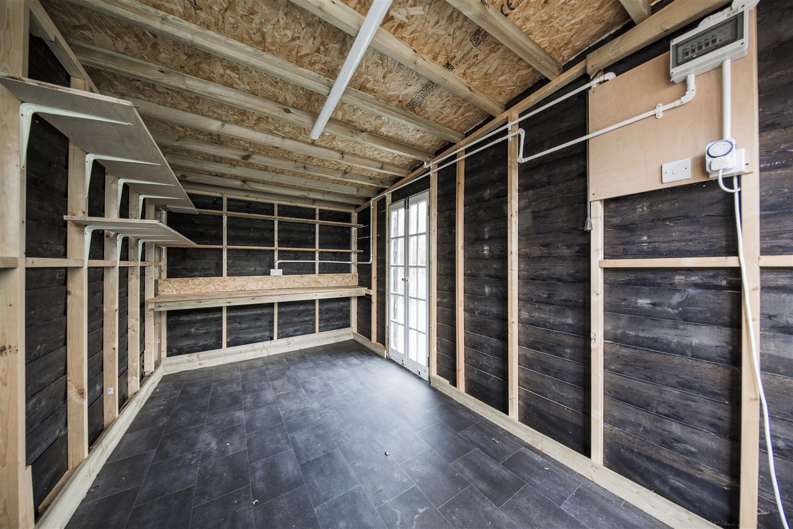 Through double timber doors with double glazed door to side.