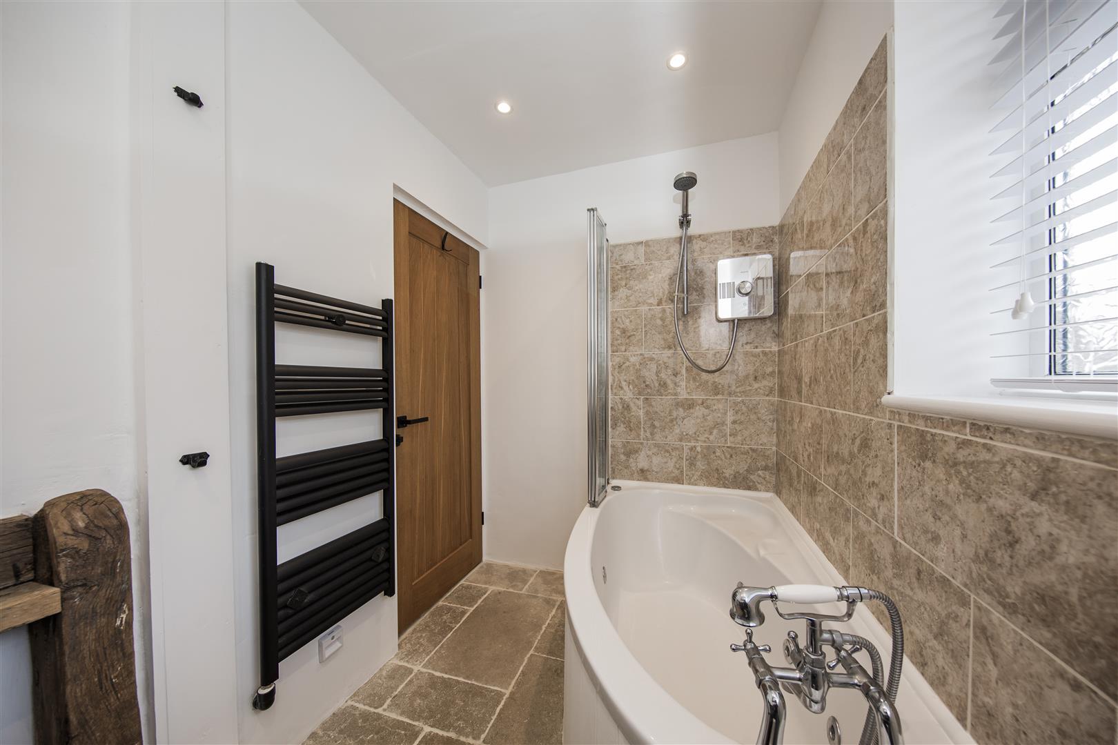 Double glazed window to side with blind. Suite comprising: Corner jacuzzi bath with shower attachment and glazed screen, wc. Custom made oak table with circular stone wash hand bowl and tap. Vertical radiator. Marble tiling surround. Underfloor heating.