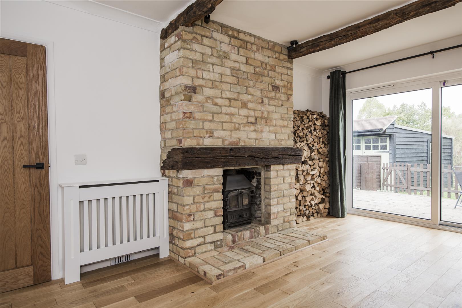 Double glazed patio doors leading out onto rear garden. Feature brick chimney breast with cast iron log burning stove inset with timber mantle. Radiator enclosed in fretwork cabinet. Exposed beams. Down lighting. Laminate floor.