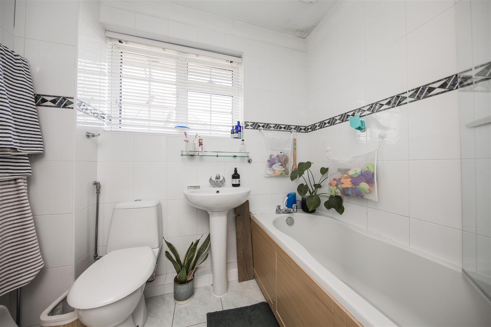 Double glazed window to side. Suite comprising: panelled bath with shower & screen. Wash hand basin. Small vanity unit. Fully tiled surround. Tiled floor.