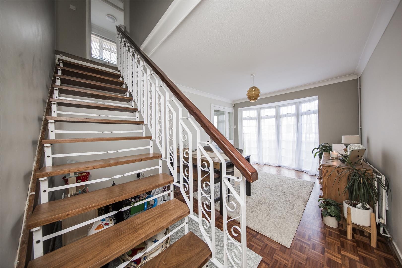 Double glazed Floor to ceiling multi paned Georgian style bow window to front. Parquet flooring. Attractive wrought iron/timber staircase leading to first floor.