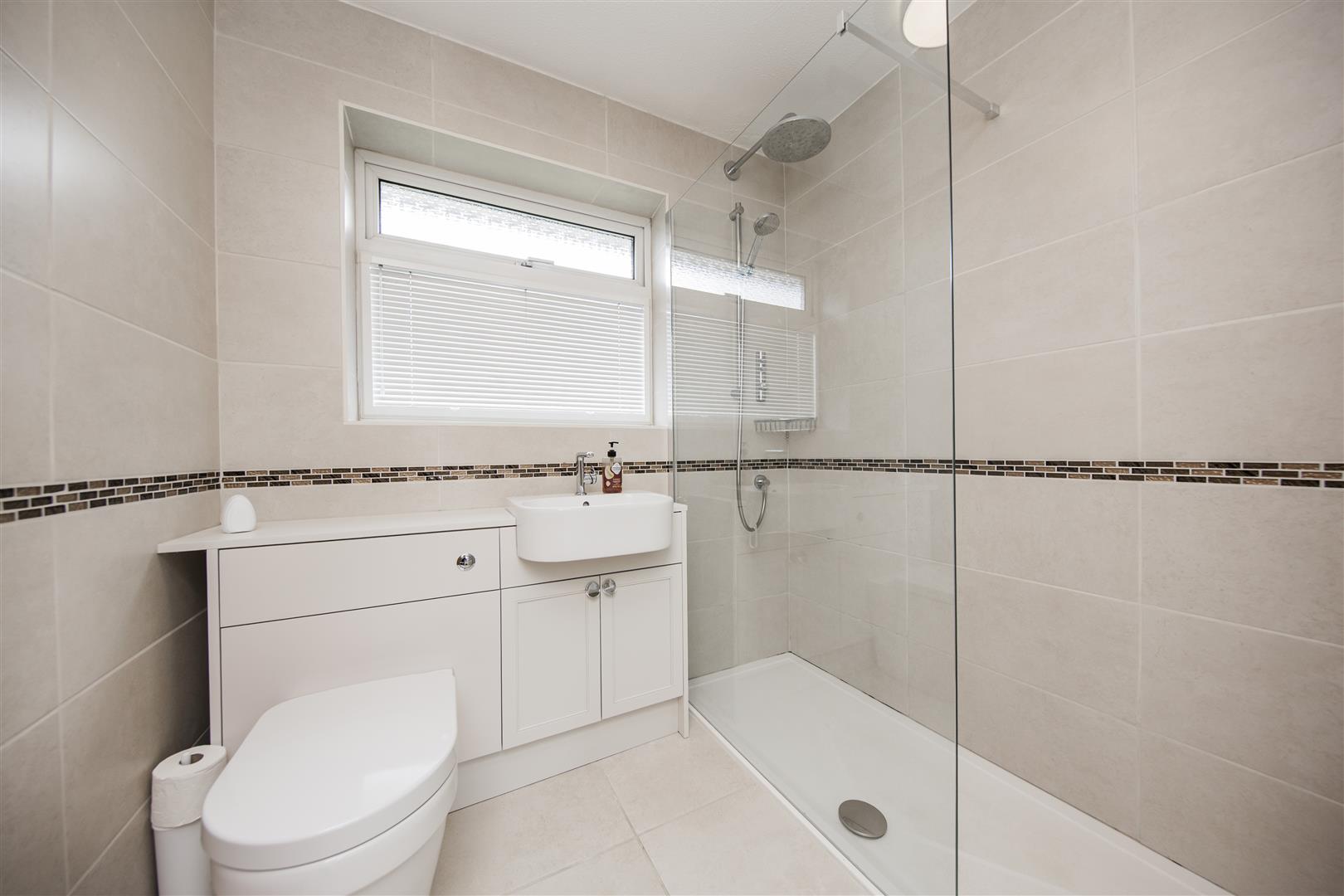 Double glazed window to rear. Suite comprising: Large shower cubicle with glass screen, vanity unit with sink inset and cupboard under, wc. Vertical radiator. Fully tiled surround
