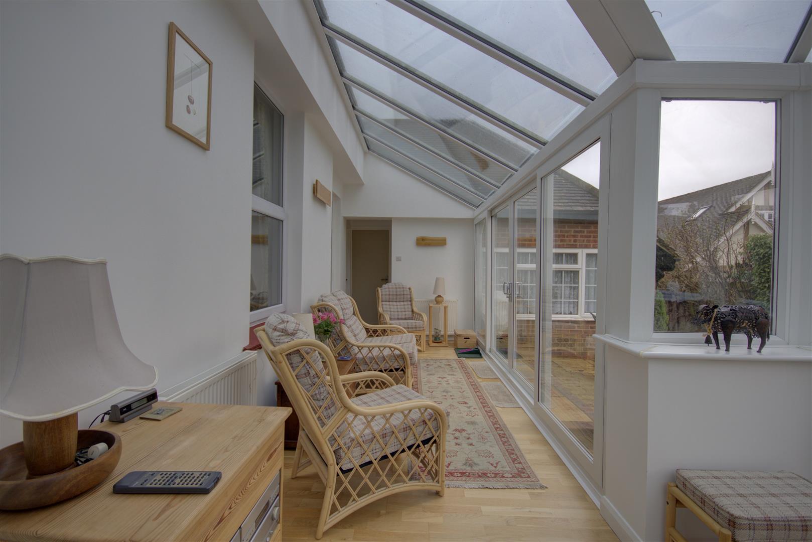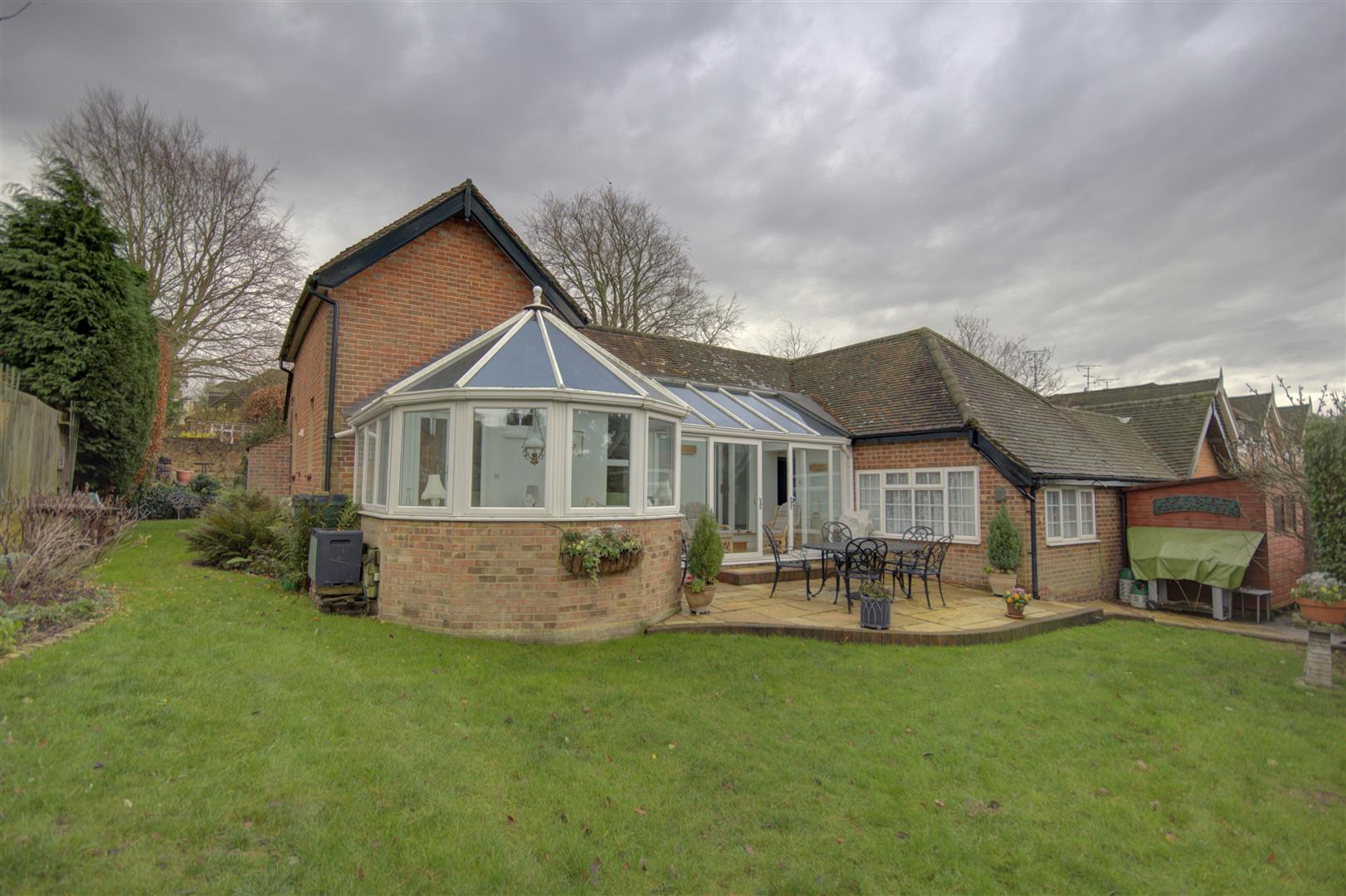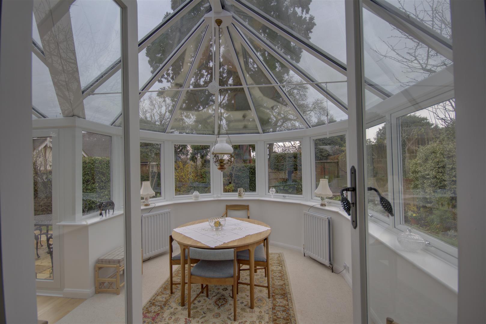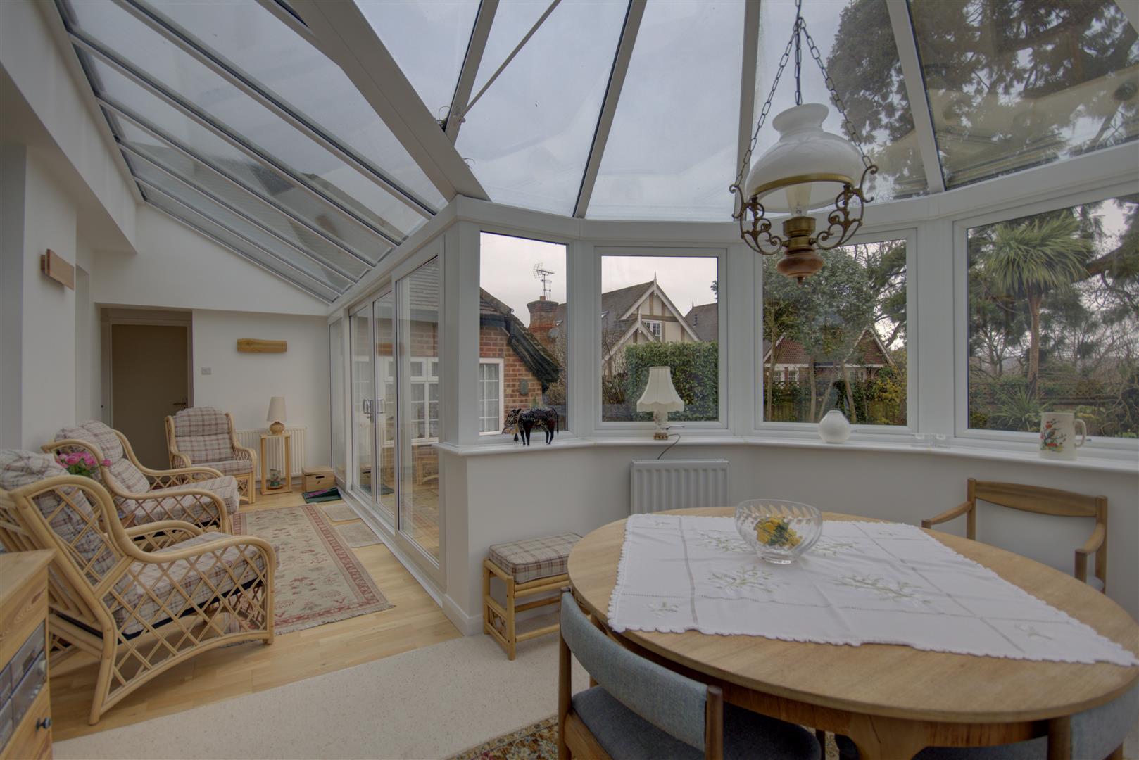 The conservatory is a particular highlight, extending to over 26 feet in length with a striking curved frontage. This bright and elegant space enjoys views across the rear garden and provides a wonderful additional reception area, with doors opening out and internal access to the ground-floor bedroom suite.