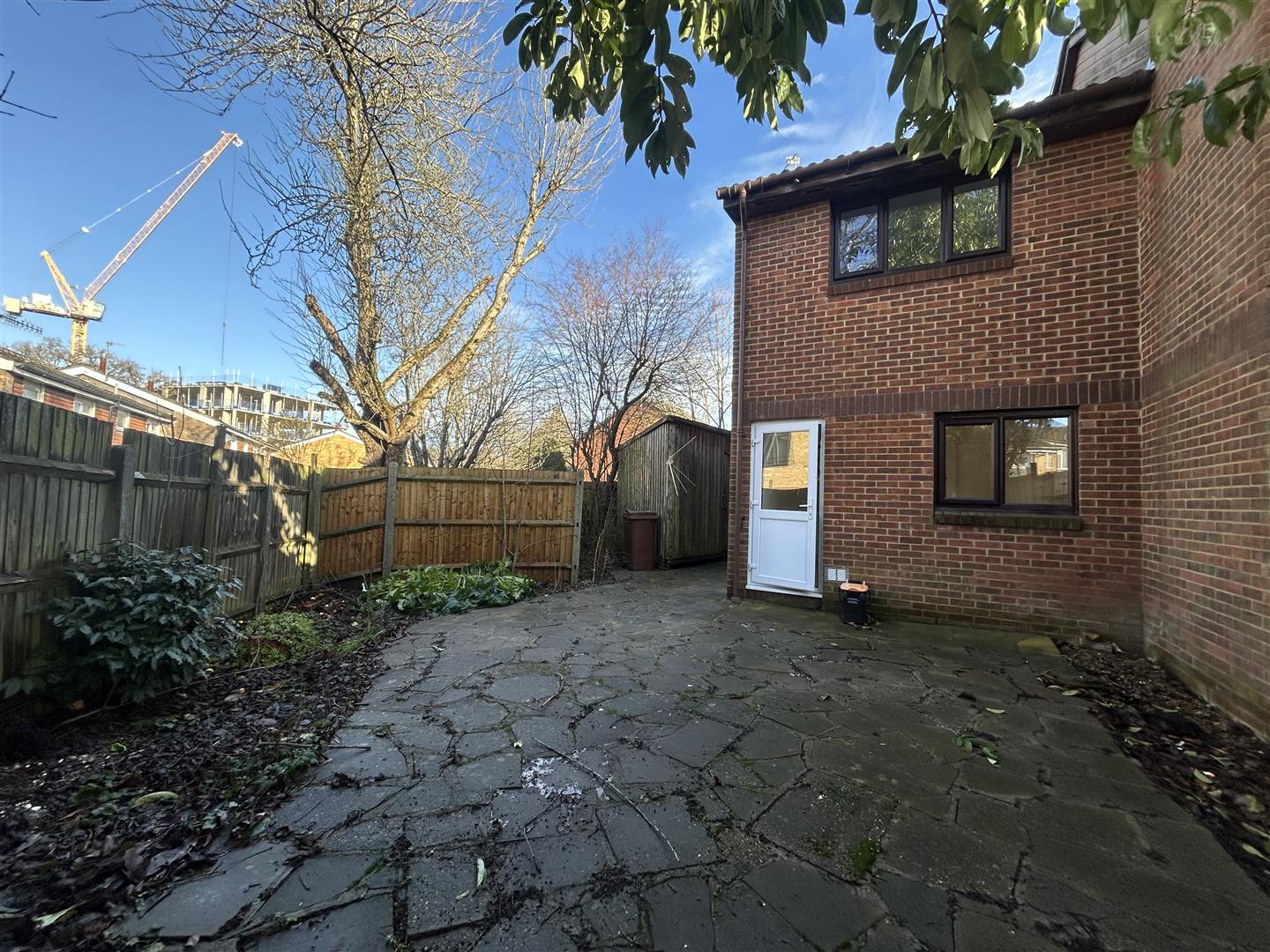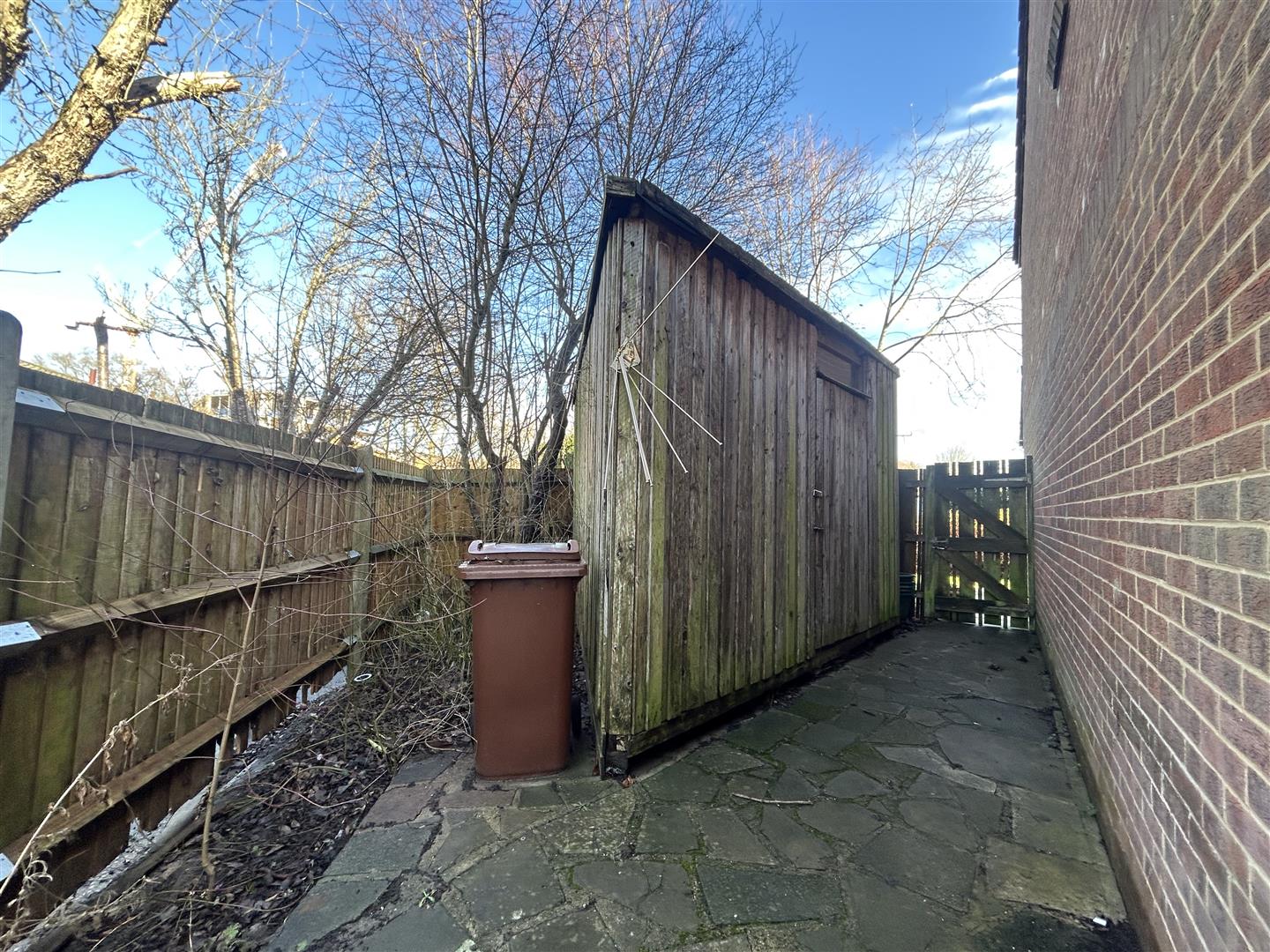 The ground floor features a bright and contemporary open-plan living, dining and kitchen area, designed for modern living and entertaining. A rear door leads directly out to a private patio garden, while the property also benefits from useful side access and a large external shed positioned to the side of the house, ideal for storage, bikes or garden equipment.