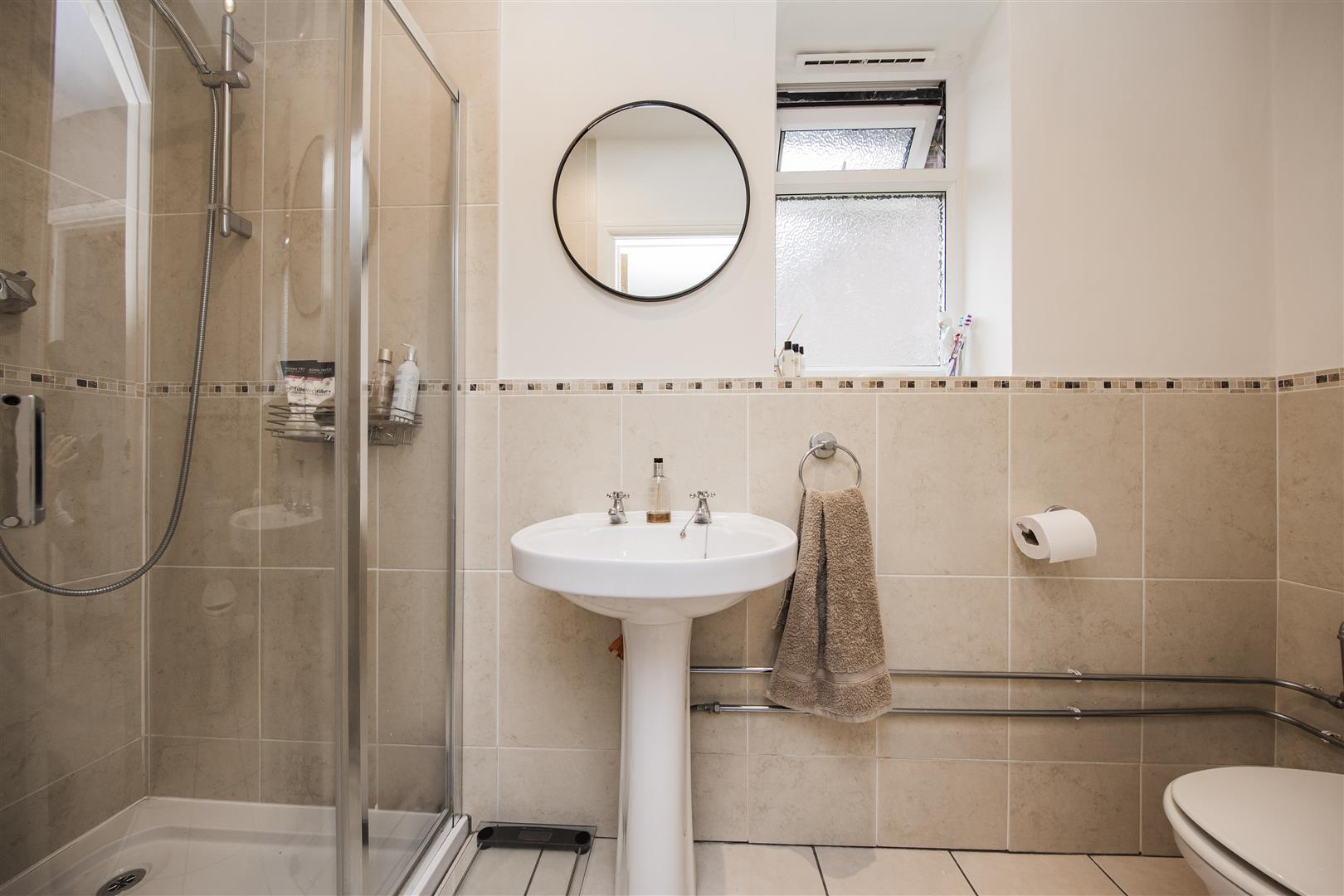 The en suite shower room off the master bedroom features a walk-in shower, a pedestal sink, and a toilet, all finished with neutral tiling and a window providing natural light and ventilation.