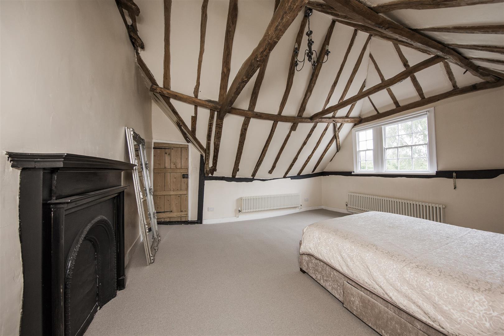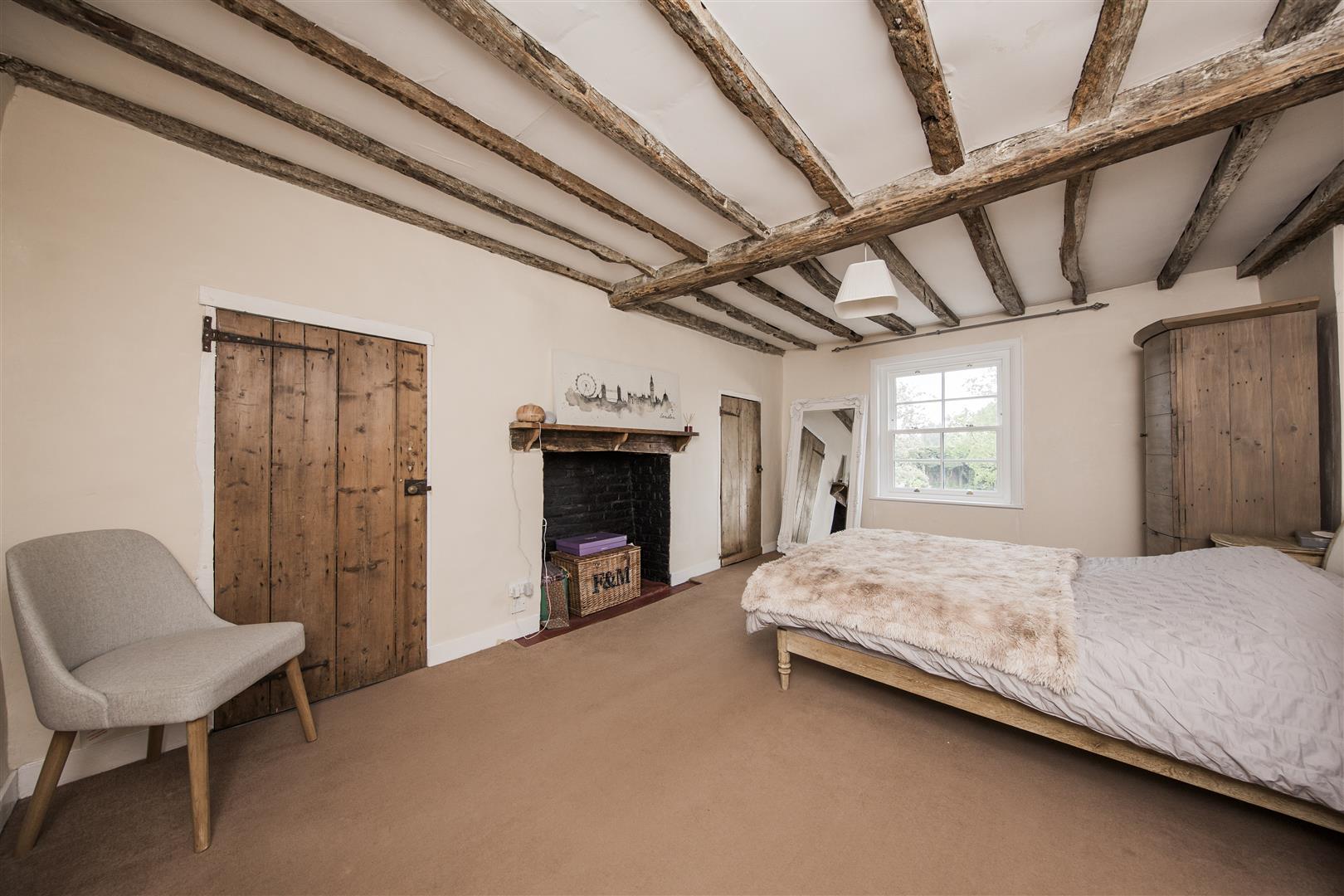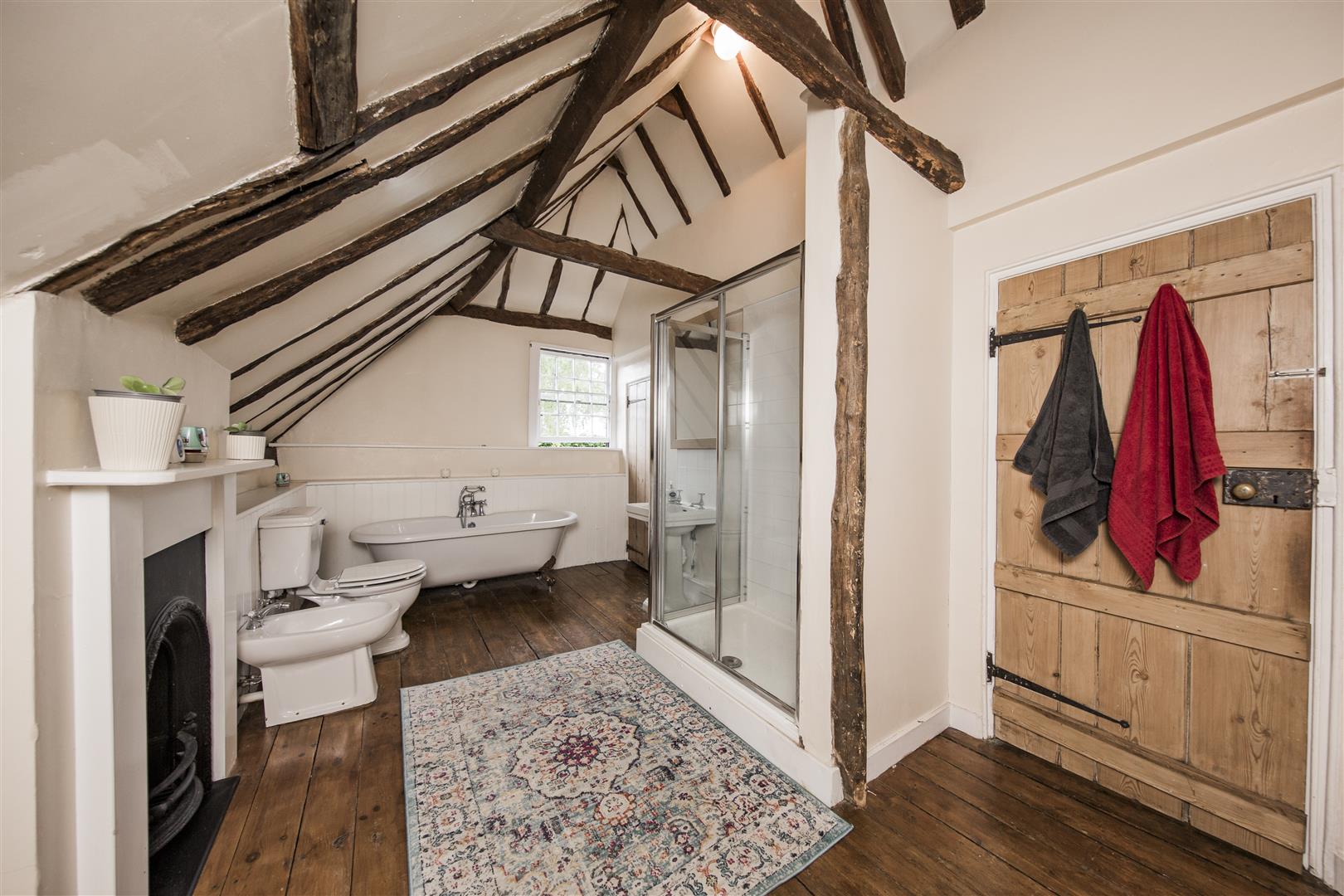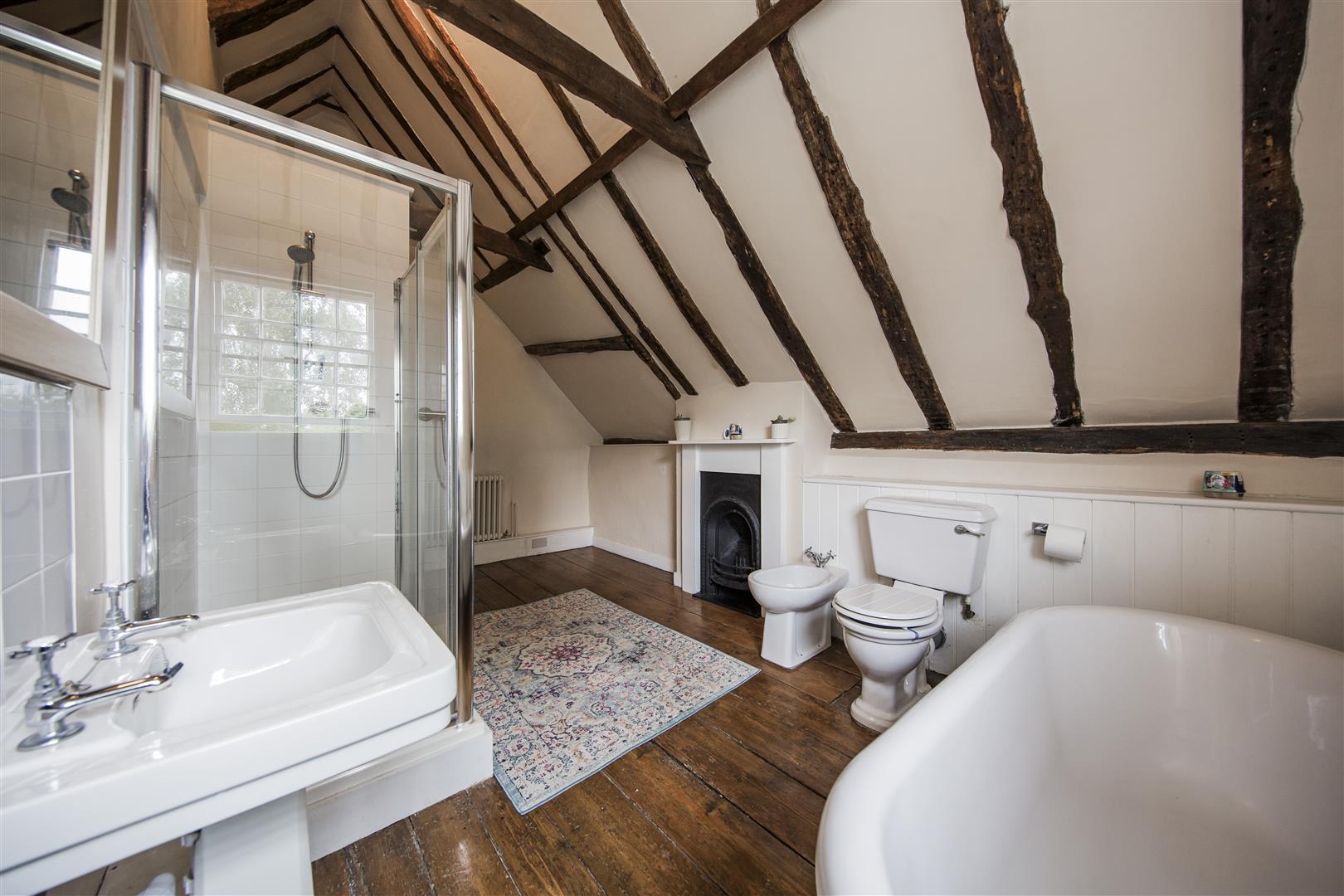 To the first floor the house has three bedrooms including the principal room with ensuite shower and built in wardrobe aside the feature fireplace. Exposed beams are present in all the bedrooms. Two large double bedrooms share the use of the four piece family bathroom with roll top bath and separate walk in shower.