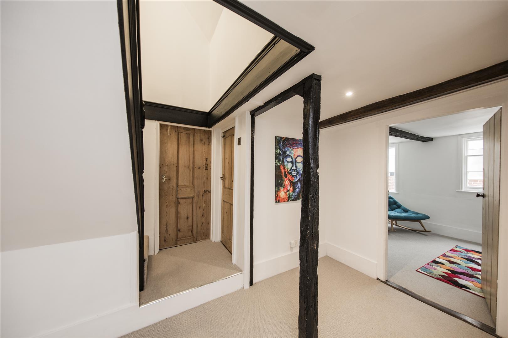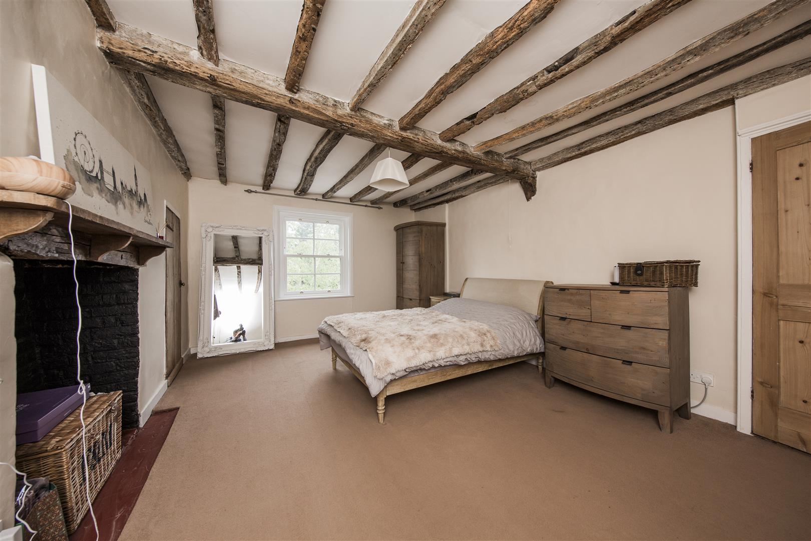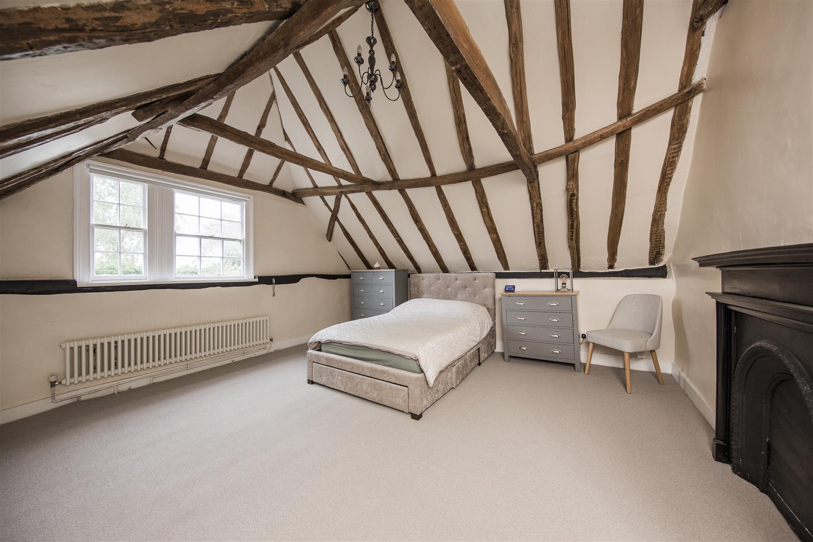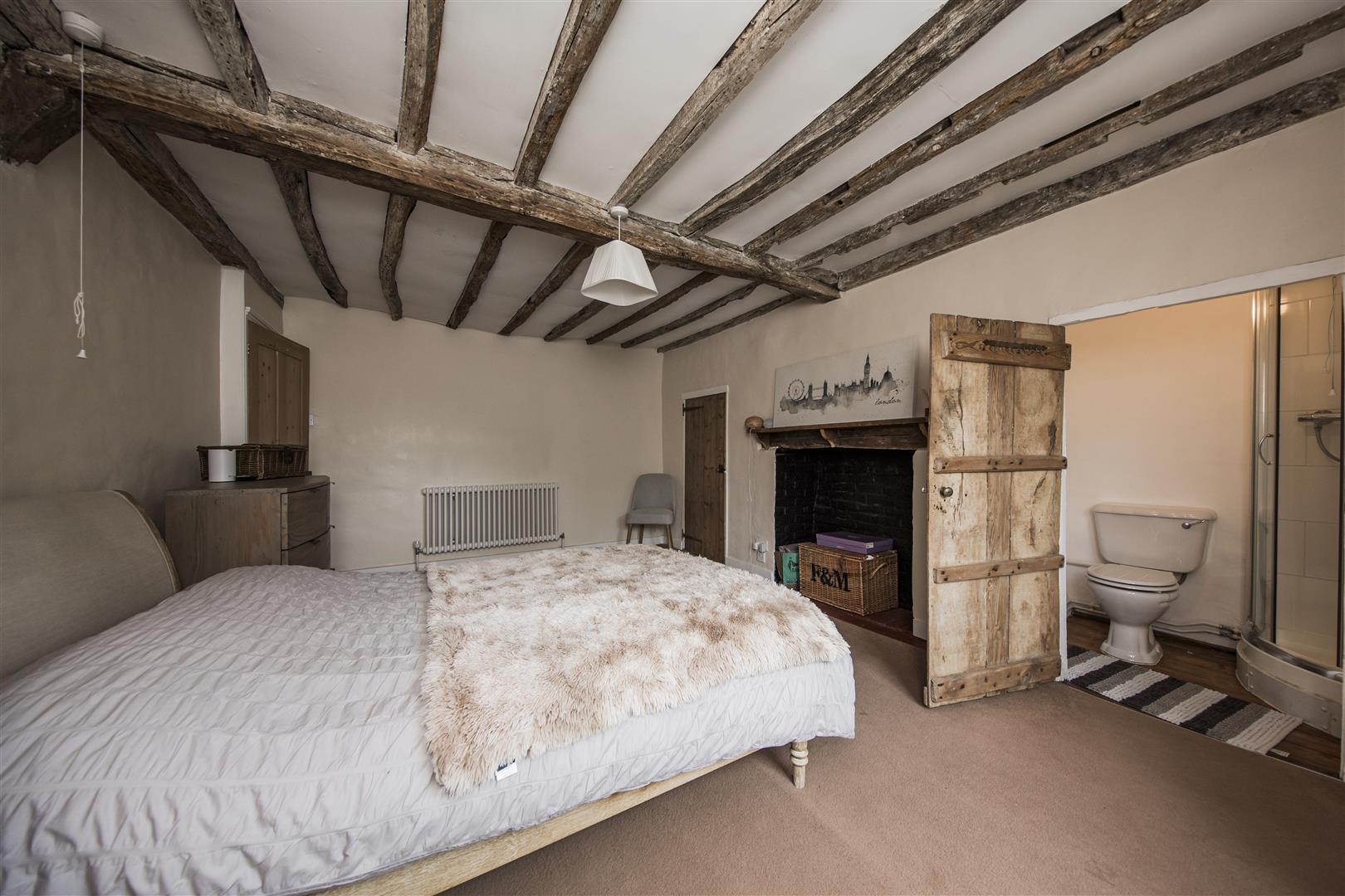 To the first floor the house has three bedrooms including the principal room with ensuite shower and built in wardrobe aside the feature fireplace. Exposed beams are present in all the bedrooms. Two large double bedrooms share the use of the four piece family bathroom with roll top bath and separate walk in shower.
