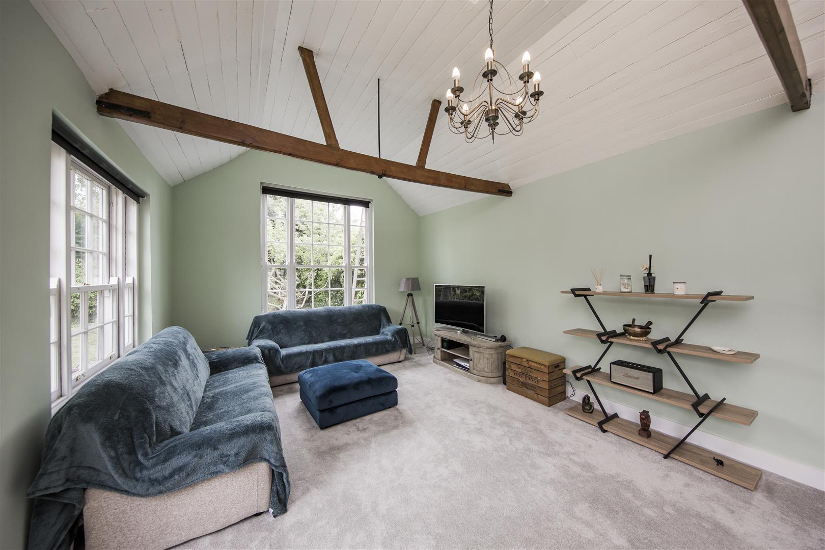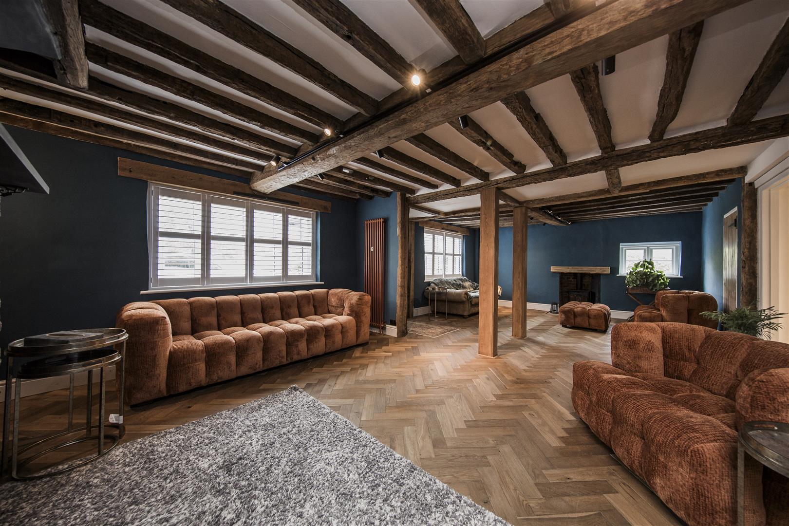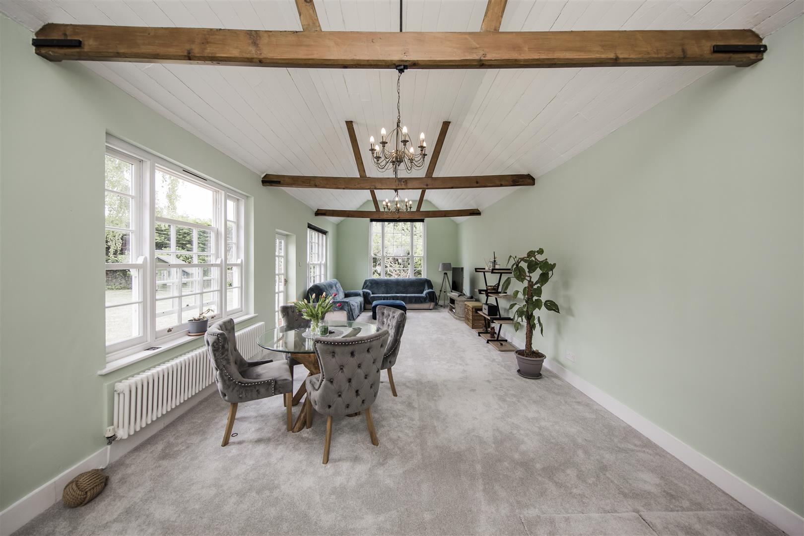 To the other side of the hallway is a reception room that is currently used as a study / office and offers great flexibility with its period fireplace and beam continues the characterful theme. Access to the rear lobby that includes a good sized utility / boot room, and large storage cupboard. A conservatory / orangery room sits the other side of the study and continues the journey into the coach house. A substantial room, over 33 ft long with double aspect windows and exposes A frame beams to the vaulted ceiling. One of the vendors favourite rooms to take in the great garden to the rear and this space boasts a downstairs shower room. This in our opinion could be adapted to be an annexe of some kind given its size and facilities to be adapted for the need of an older family member. As previously mentioned a two chamber cellar with indications of its former use as a coaching inn with its raised barrel supports. An area that is a great store or could offer options for further conversion.