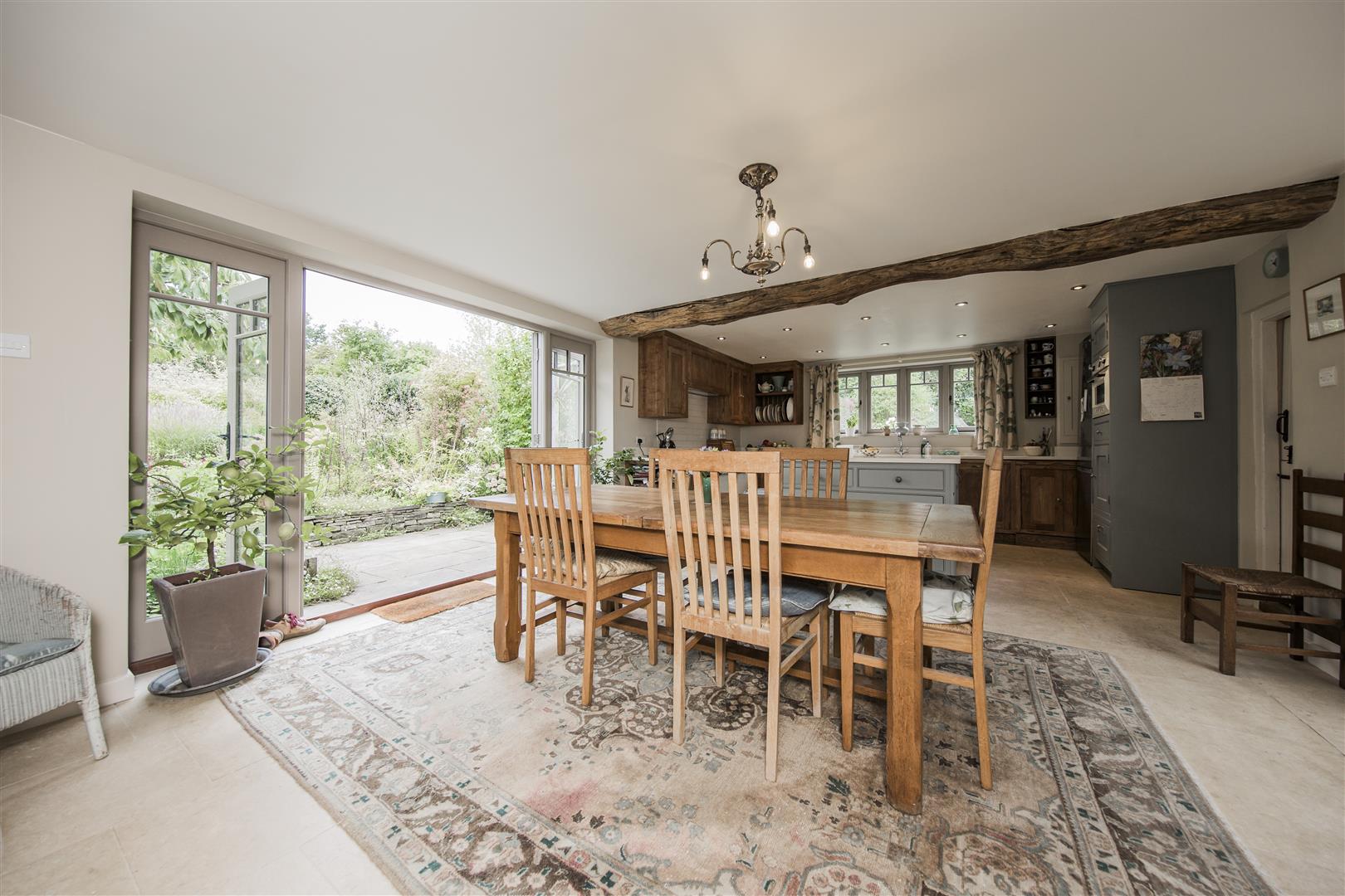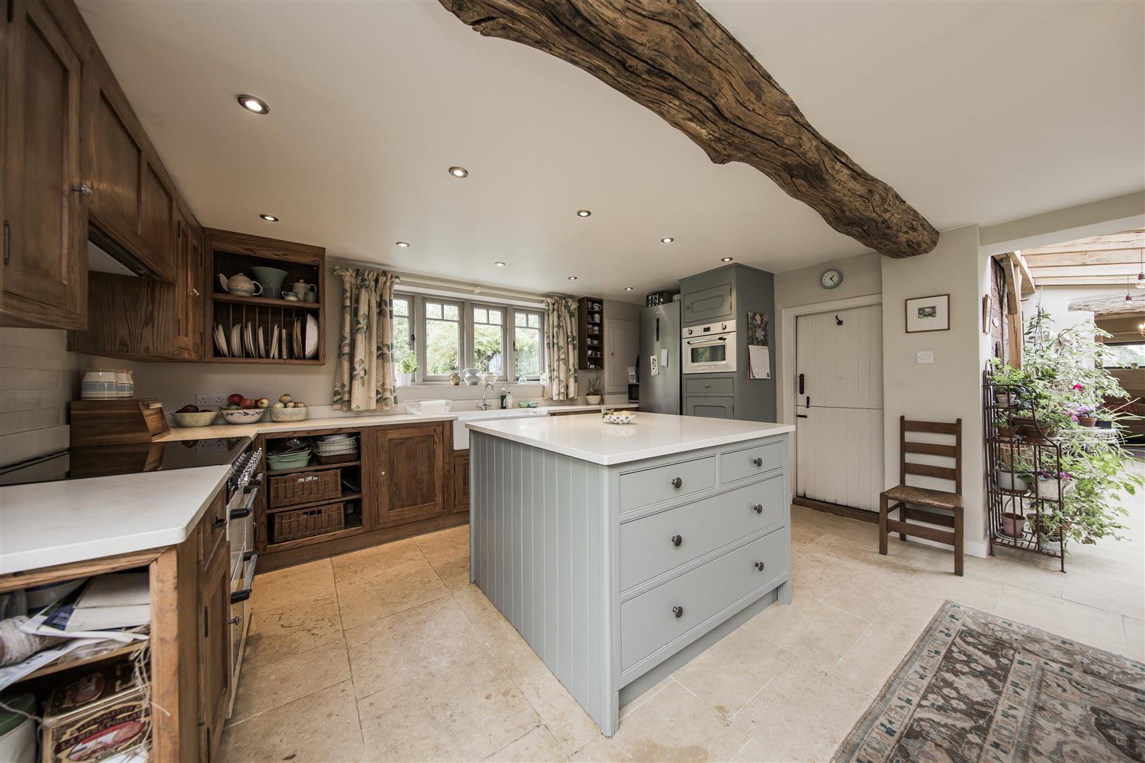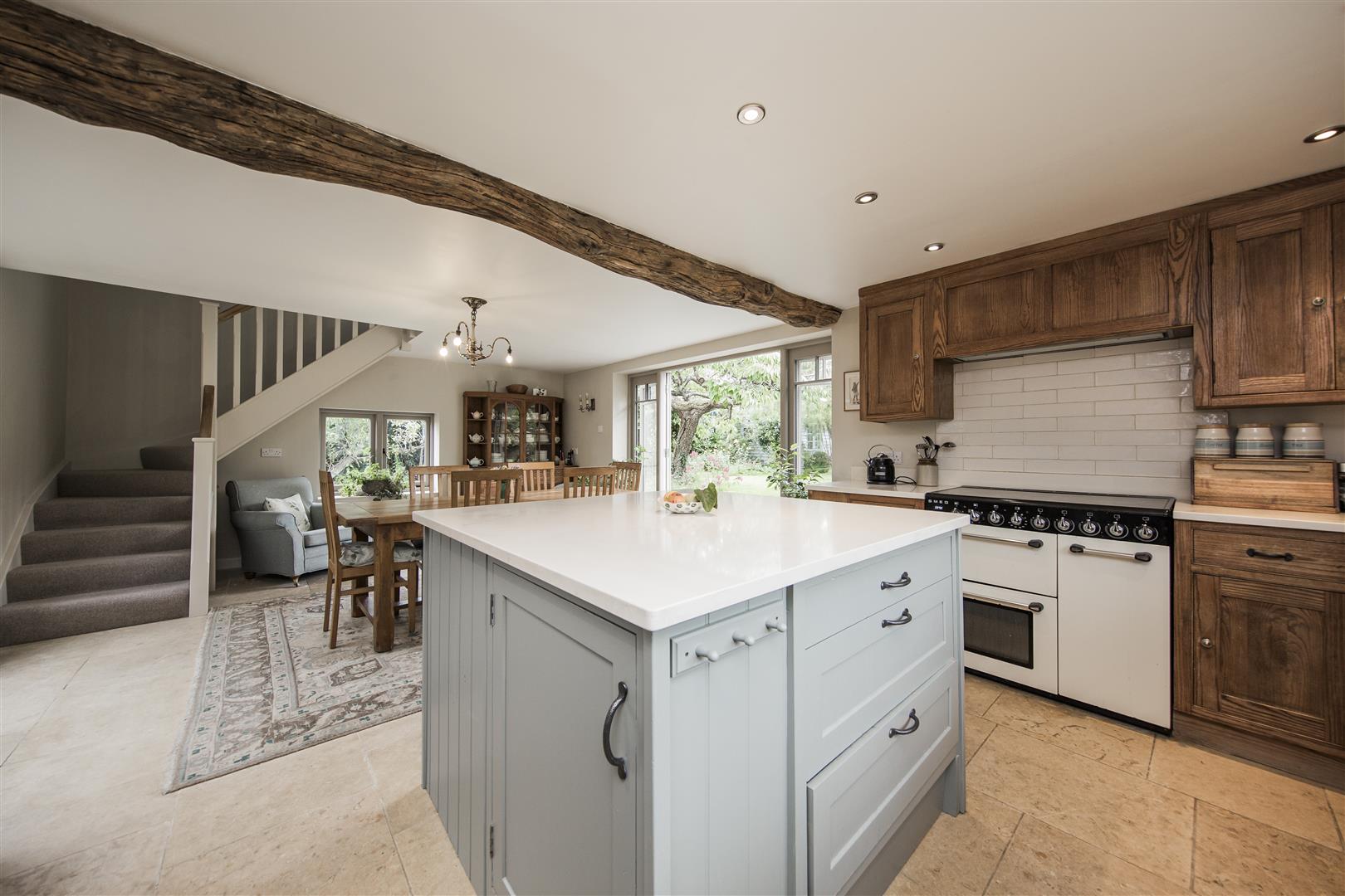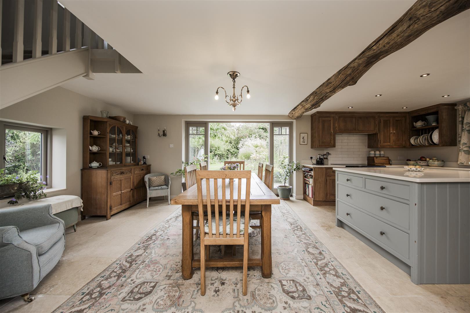 An open-plan kitchen, diner, and family room that blends contemporary practicality with characterful touches. An Exposed wooden ceiling beam run across the space, complementing the mix of natural wood cabinetry and a central island painted in soft grey with an ivory worktop. The kitchen is well-equipped with integrated appliances, including a large range cooker, and features a limestone floor. A sizeable wooden dining table sits centrally, with double doors that open to the garden, filling the space with natural light and offering easy access to outdoor living.