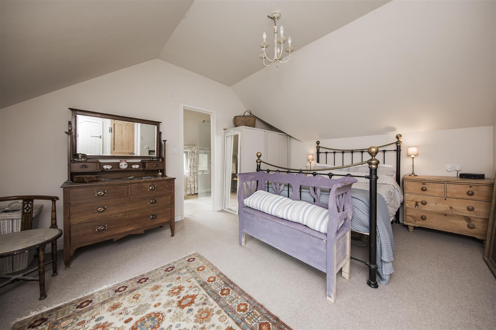 The master bedroom is a bright and spacious room with a sloping ceiling and neutral carpeting. It is furnished with a wrought iron bed frame and classic wooden furniture, including a dressing table and chest of drawers. The room benefits from an en suite bathroom and overlooks the garden, creating a peaceful retreat.