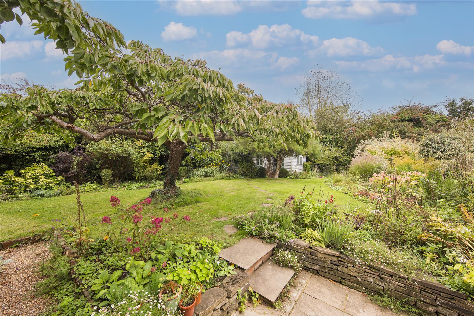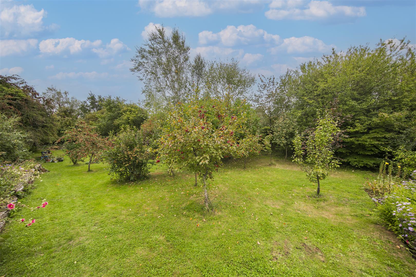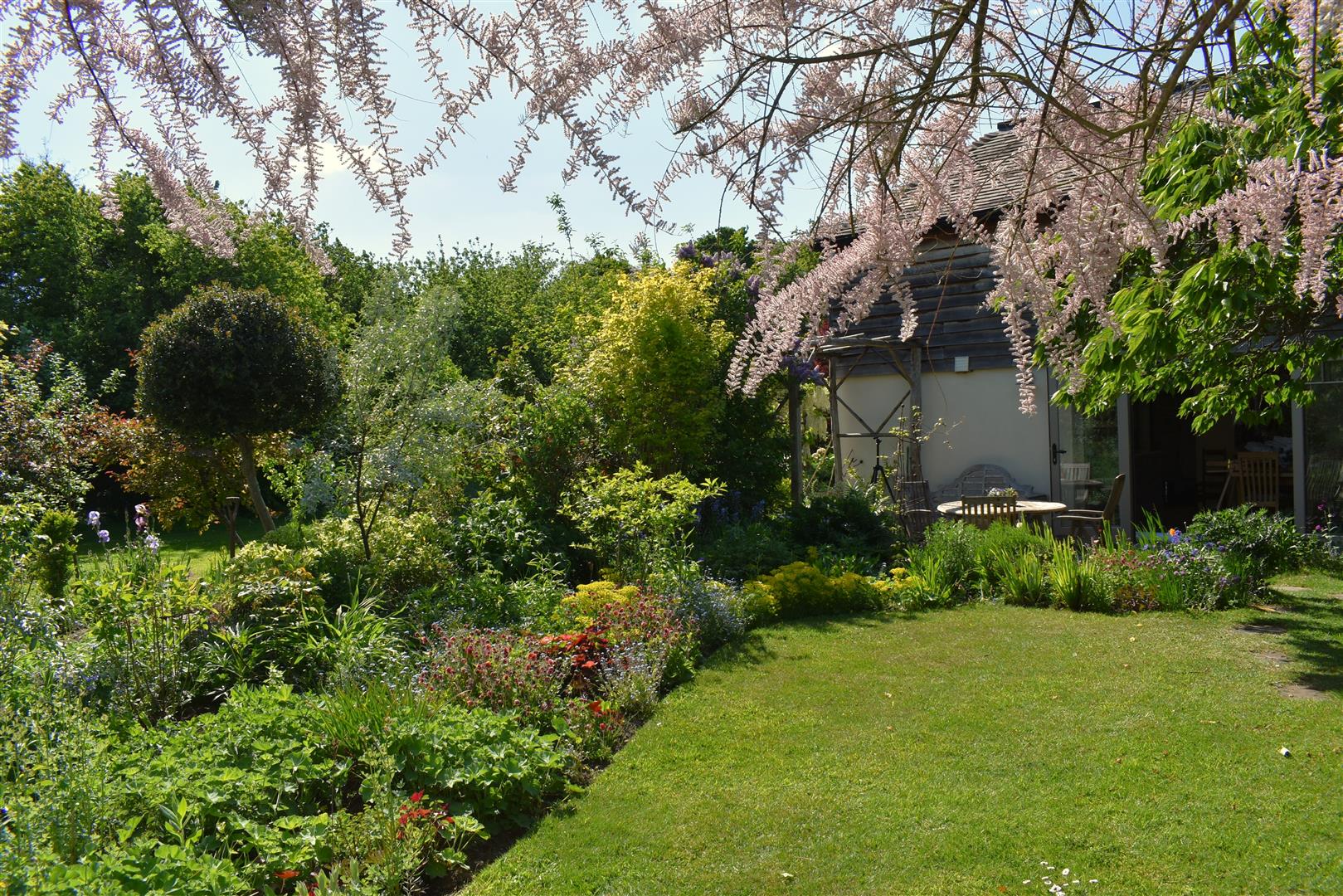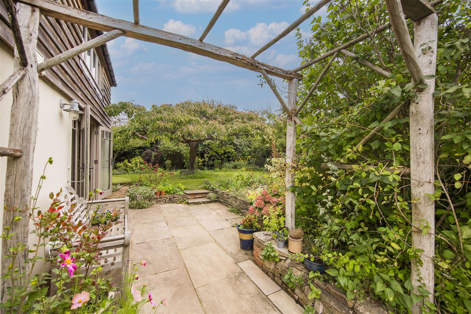 The romantic, wildlife friendly garden surrounding the property is a beautifully maintained informal space that blends natural woodland charm with cultivated beds. Mature trees and a vast variety of shrubs and flowering plants provide privacy, colour, and texture throughout the seasons. There are several seating areas including a paved patio beside the house and lawned spaces framed by borders filled with perennials and climbers. Additional features include a wisteria-covered pergola, a sunken garden with a pond, and garden sheds, all set within a tranquil rural setting with views over the surrounding countryside.