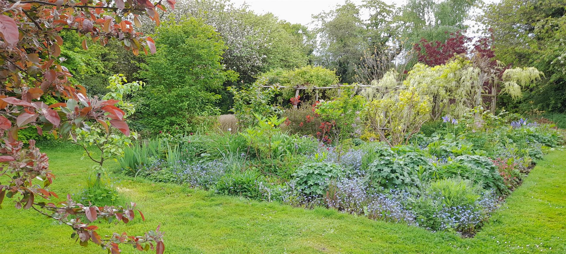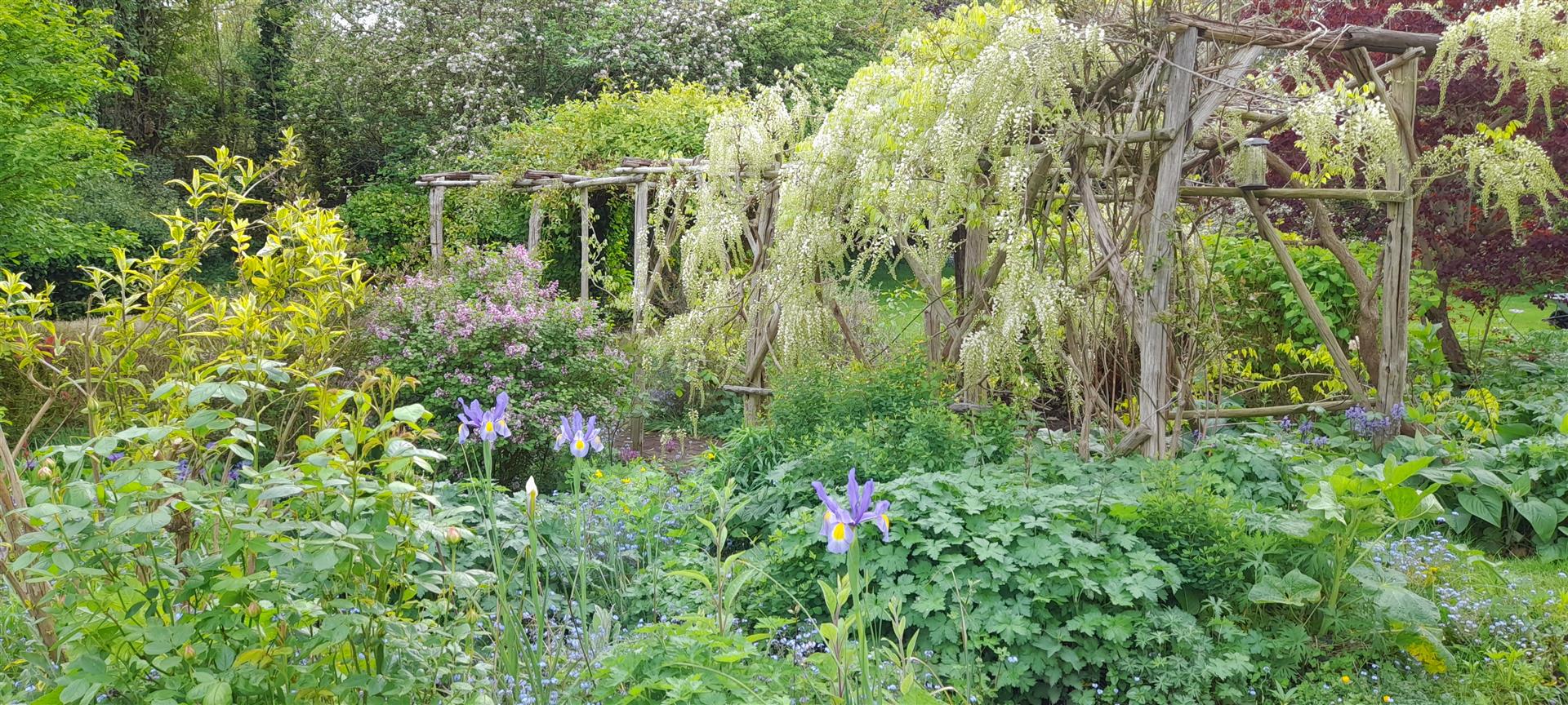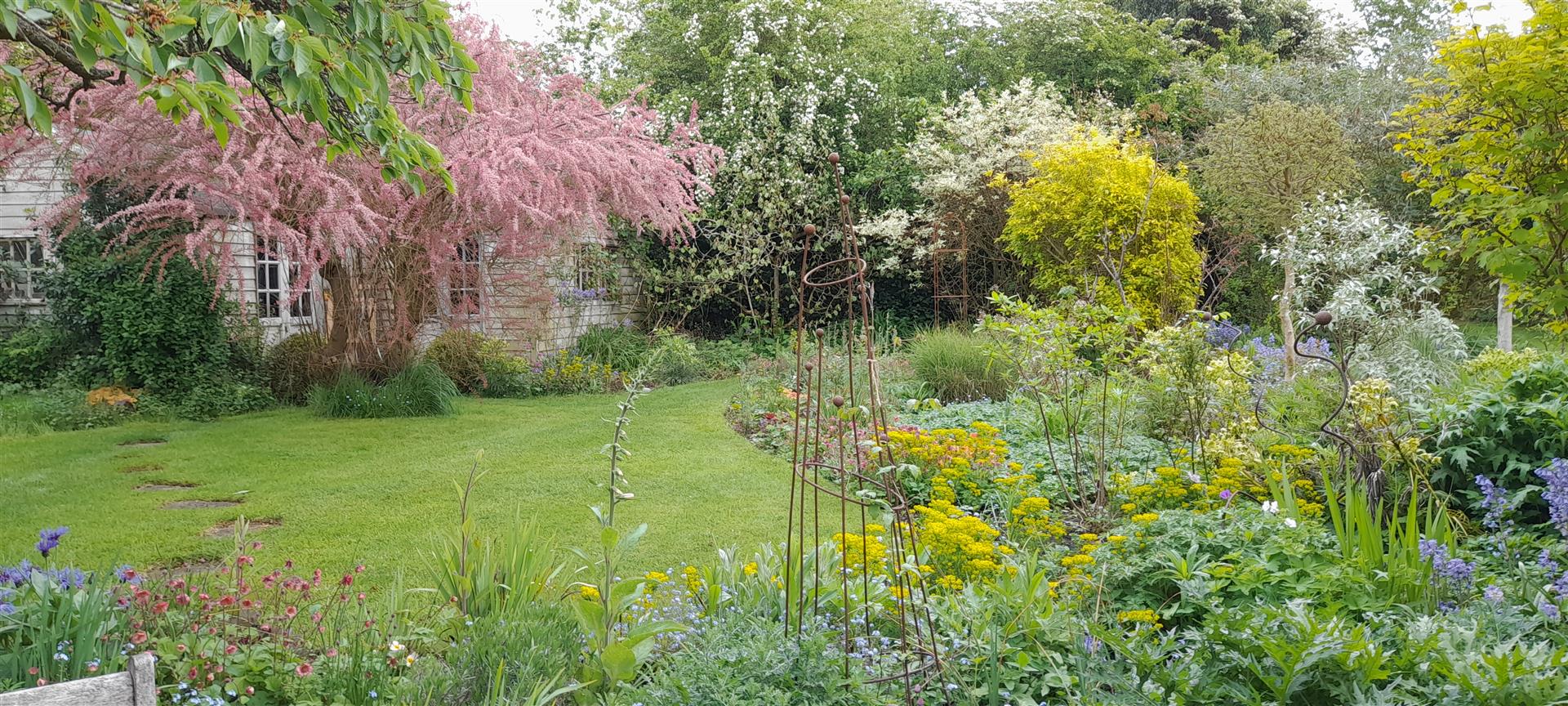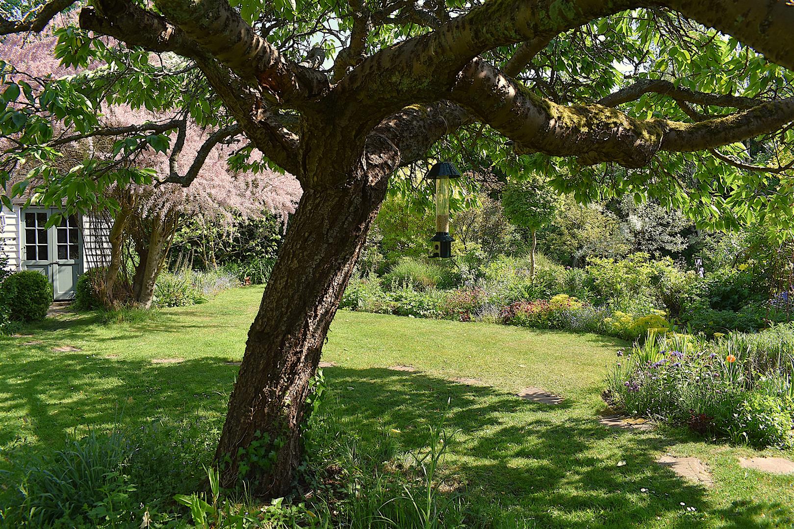 The romantic, wildlife friendly garden surrounding the property is a beautifully maintained informal space that blends natural woodland charm with cultivated beds. Mature trees and a vast variety of shrubs and flowering plants provide privacy, colour, and texture throughout the seasons. There are several seating areas including a paved patio beside the house and lawned spaces framed by borders filled with perennials and climbers. Additional features include a wisteria-covered pergola, a sunken garden with a pond, and garden sheds, all set within a tranquil rural setting with views over the surrounding countryside.