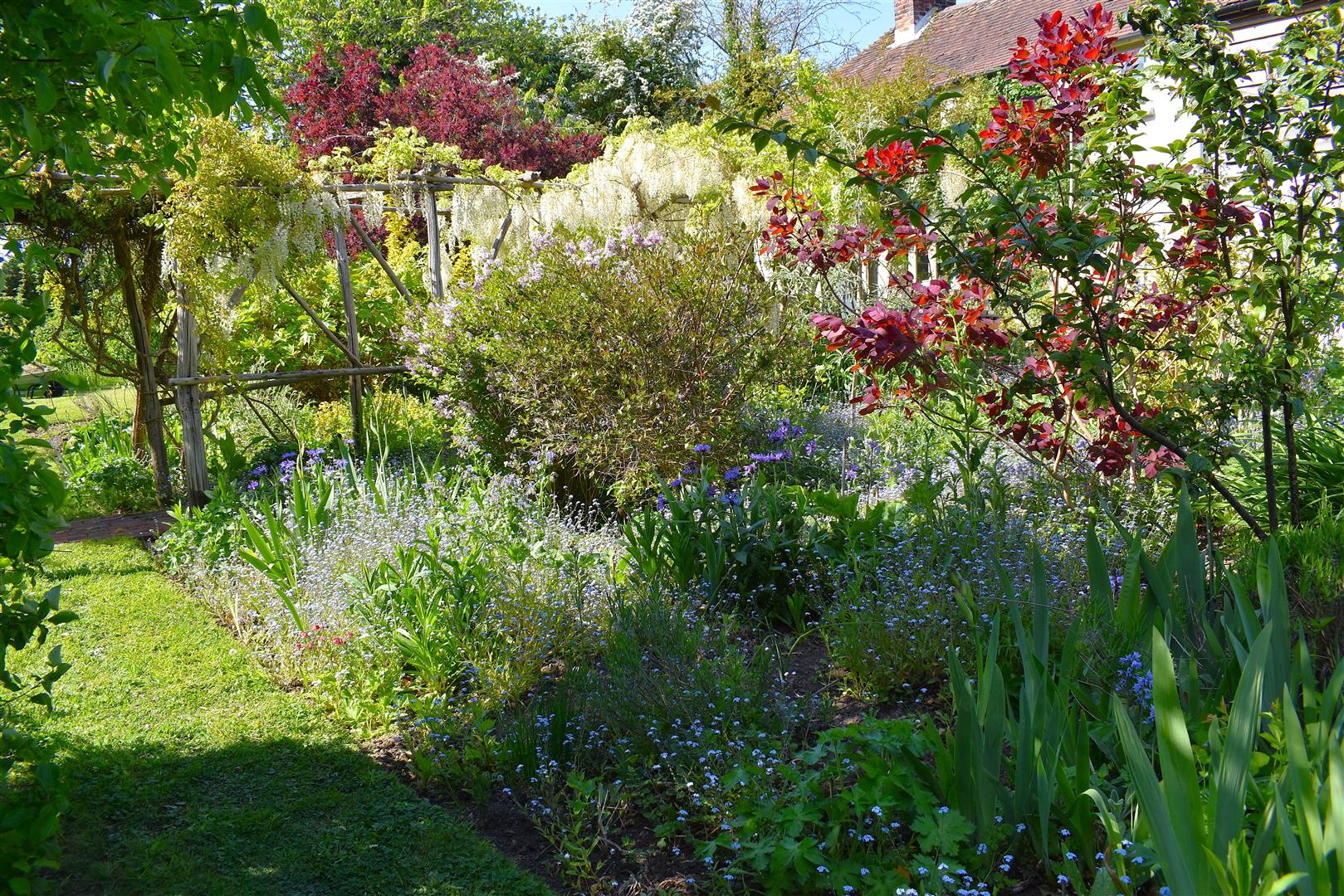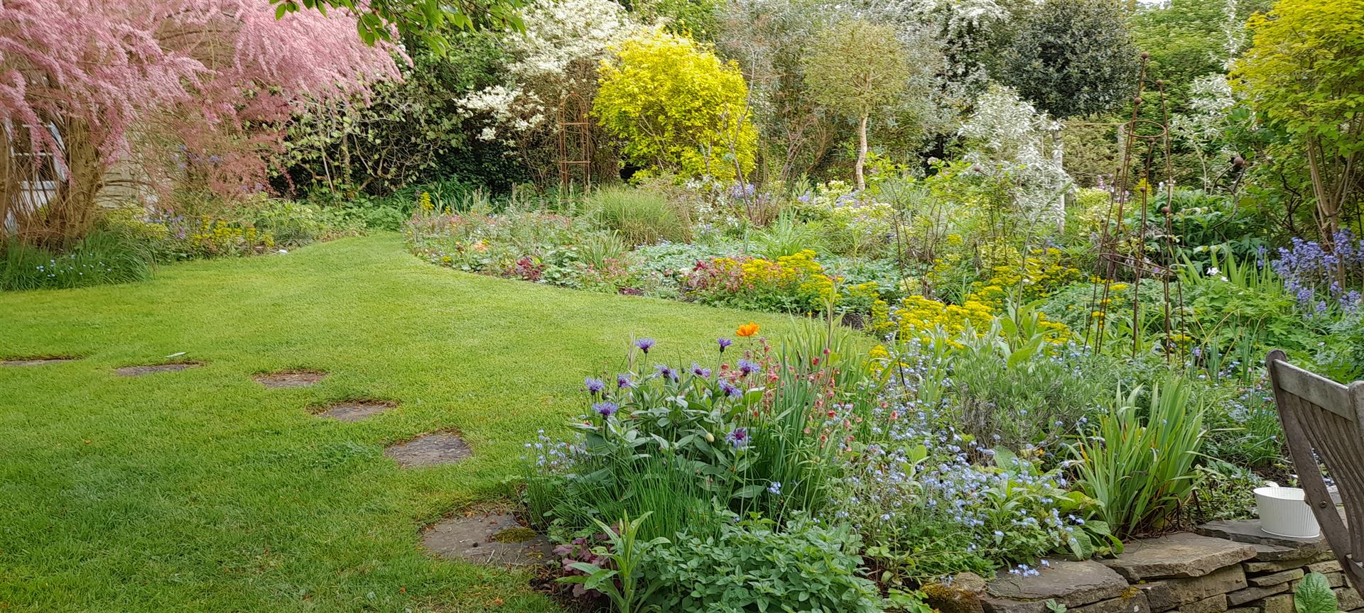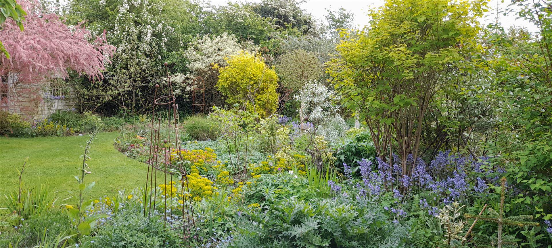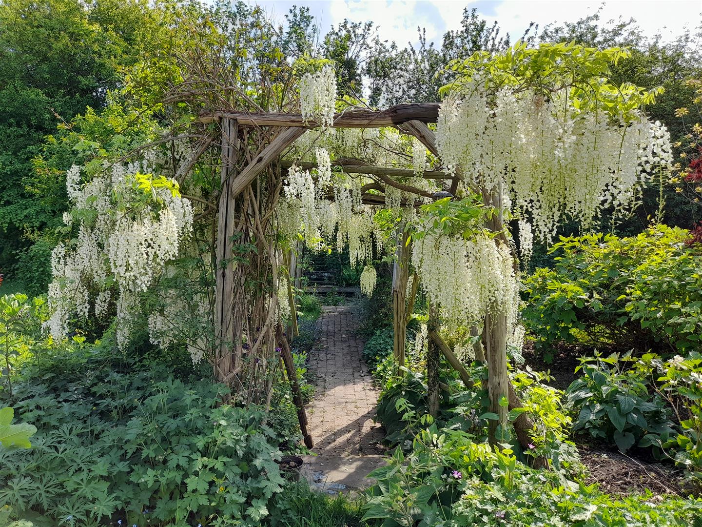 The romantic, wildlife friendly garden surrounding the property is a beautifully maintained informal space that blends natural woodland charm with cultivated beds. Mature trees and a vast variety of shrubs and flowering plants provide privacy, colour, and texture throughout the seasons. There are several seating areas including a paved patio beside the house and lawned spaces framed by borders filled with perennials and climbers. Additional features include a wisteria-covered pergola, a sunken garden with a pond, and garden sheds, all set within a tranquil rural setting with views over the surrounding countryside.