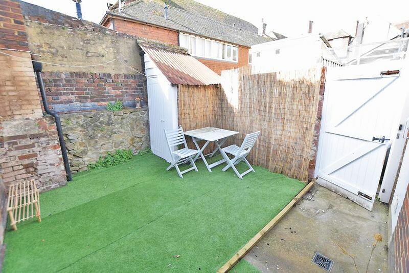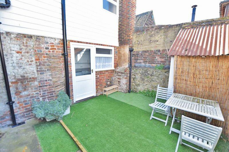 The courtyard garden is a private and low-maintenance outdoor space with artificial lawn and a paved area. It is enclosed by brick and stone walls, providing a sheltered feel. There is enough room for outdoor seating, making it an ideal spot for relaxing or al fresco dining. A shed is also provided for additional storage and access is given to the rear.