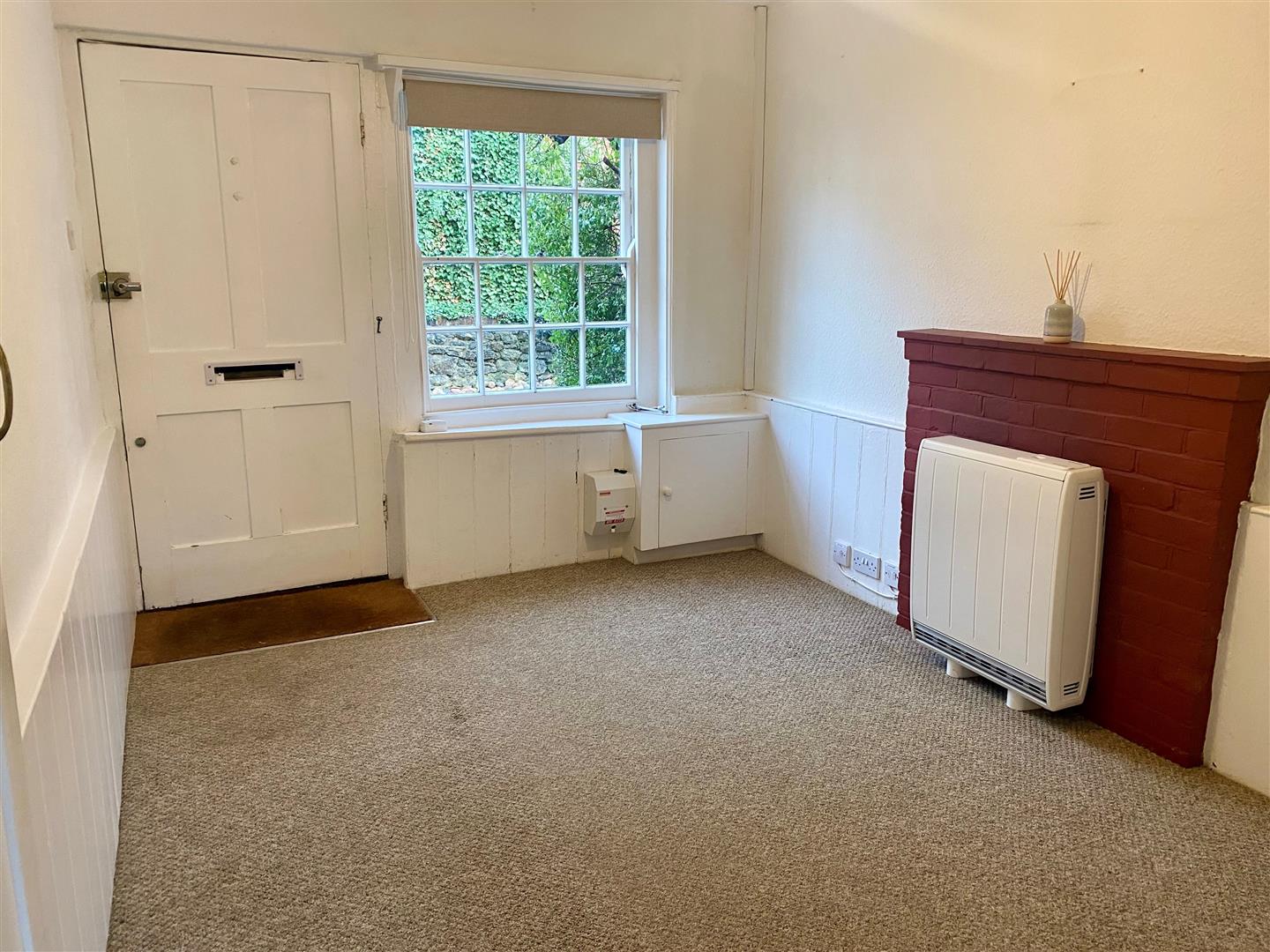 This living room is a cosy space filled with natural light from a window to the front. It features a distinctive red fireplace that adds a touch of character to the neutral walls and carpeted floor. Built-in shelving provides practical storage and display space, enhancing the room's functionality while maintaining a welcoming atmosphere.