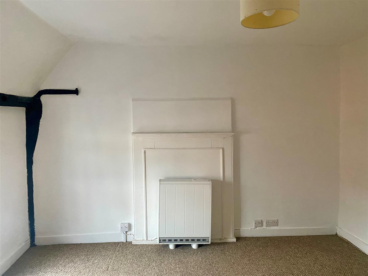 A bright bedroom with neutral walls and soft carpeting creates a tranquil retreat. A sash window allows daylight to illuminate the space, while the original wooden beams on the wall add character and a touch of rustic charm. The room’s simplicity provides a versatile canvas for personal decoration.