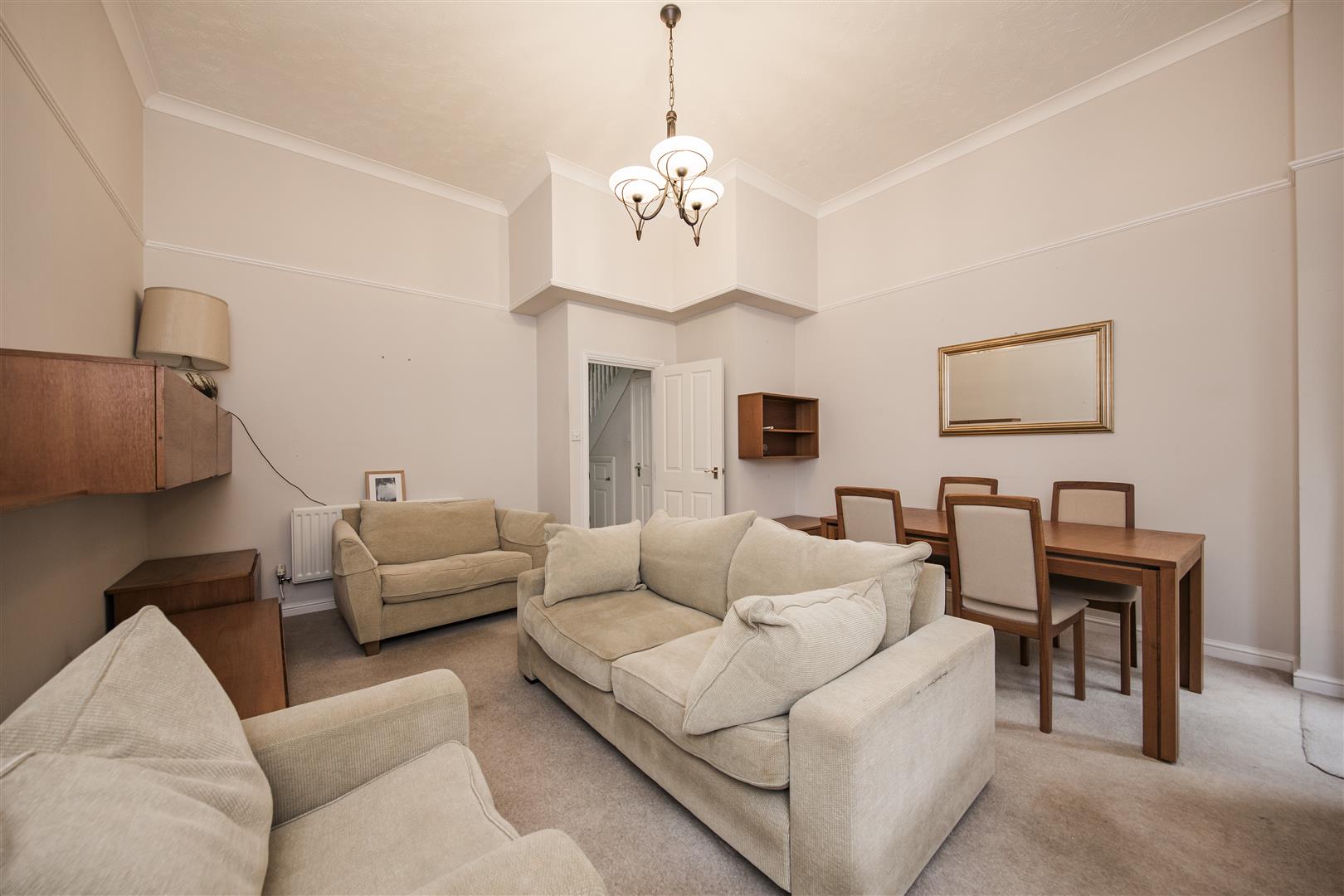 spacious Sitting Room including all soft furnishings, dining suite, TV/display unit and occasional/coffee table. Sets of curtains on poles. French Doors leading to a sunny and private Courtyard Garden with table and chairs.