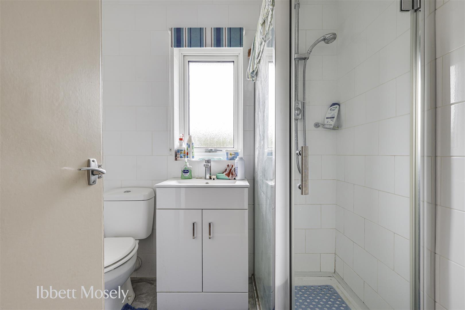 With shower cubicle, w.c., and hand basin with cupboard under. Tiled walls, double glazed window and extractor fan.