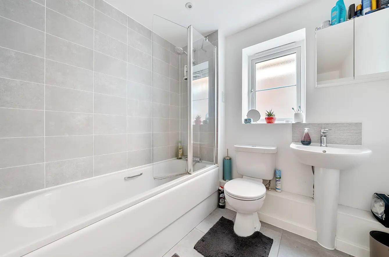 With enclosed bath with mixer tap and shower attachment, w.c. and hand basin. Chrome ladder style towel rail, part tiled walls, tiled flooring. Linen cupboard, double glazed window and extractor fan.