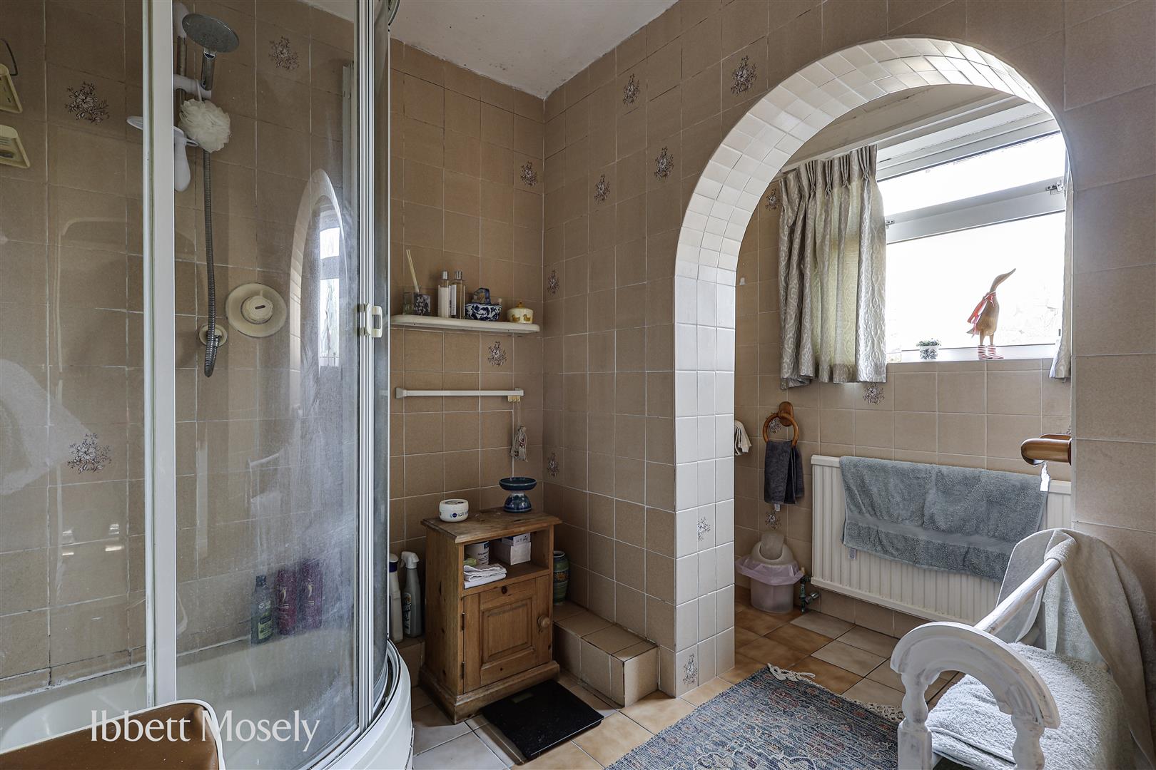 With shower cubicle, W.C. and hand basin. Radiator, double glazed window, shaver socket and tiled walls and floor.